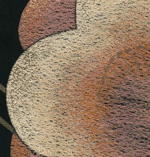 'Sugabiki,' which created fuzzy effects, added textural interest to embroidered designs by using techniques that produced soft, hair-like textures. This method was particularly effective for representing animal fur, certain types of flowers, or atmospheric effects like mist or clouds. The technique required careful control of thread tension and length to achieve the desired degree of texture without creating a messy appearance.
