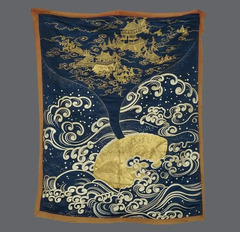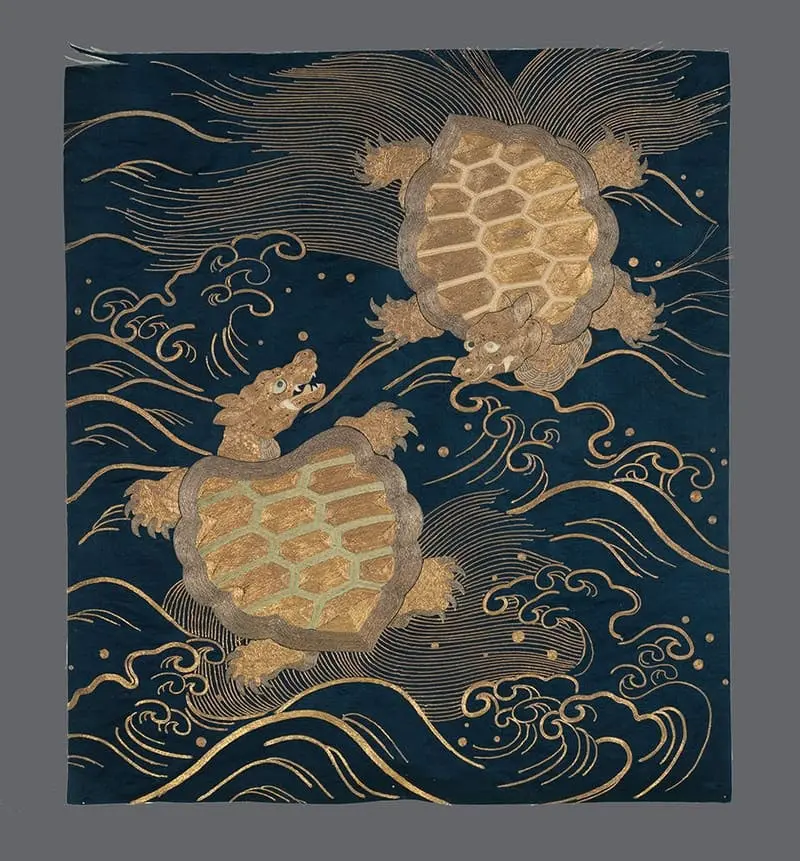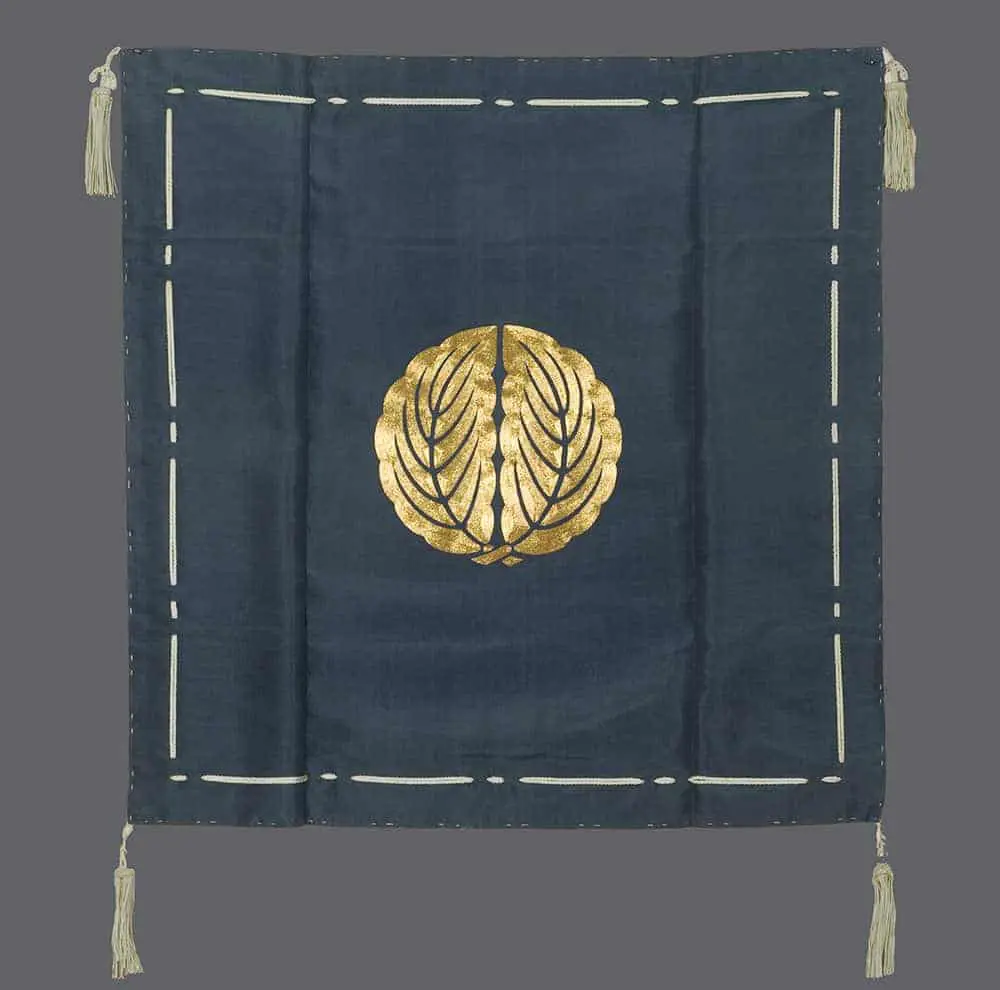 Artisans employed a variety of complex techniques to bring these motifs to life. Fukusa were usually made of silk, measuring between 20 to 44 inches square, with tassels on the corners to prevent direct contact with the fabric. The ‘face’ of the cloth displayed the primary artwork, while the reverse lining, often red or orange, was hidden beneath. Embroidery was among the most favored techniques, with gold or silver threads couched onto lustrous satin or crepe silk using fine stitches. This so-called "blue and gold" style, named for its frequent use of blue satin and gold thread, was particularly popular.