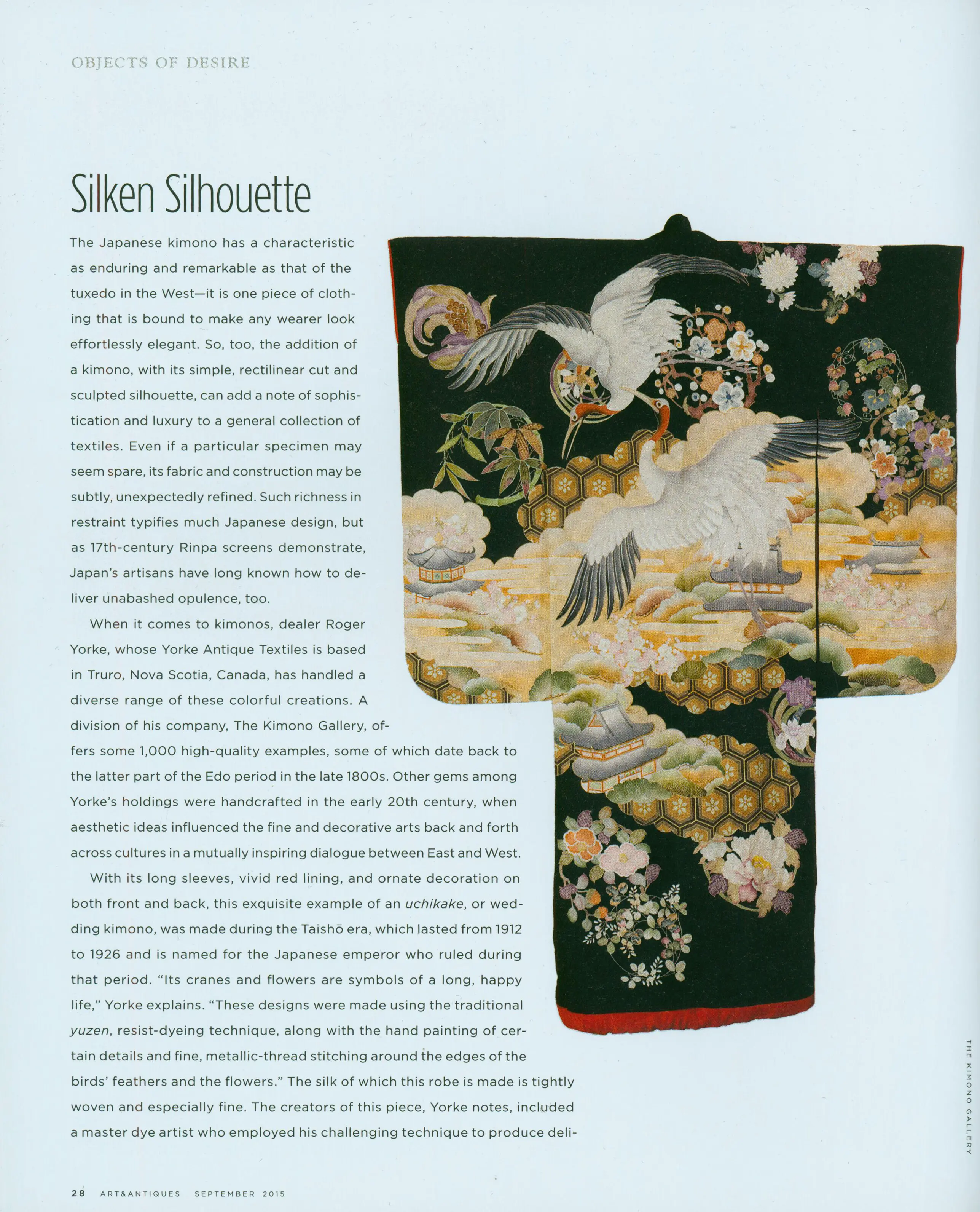 The esteemed Arts of Asia magazine in their July-August 2017 edition published "The Kimono As Art" article by Roger Yorke, partner in The Kimono Gallery and Yorke Antique Textiles. Check out the article here