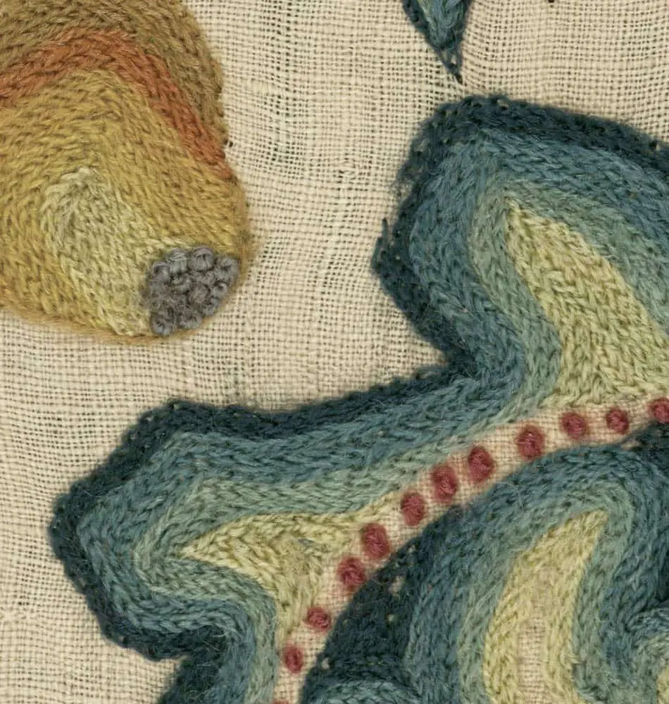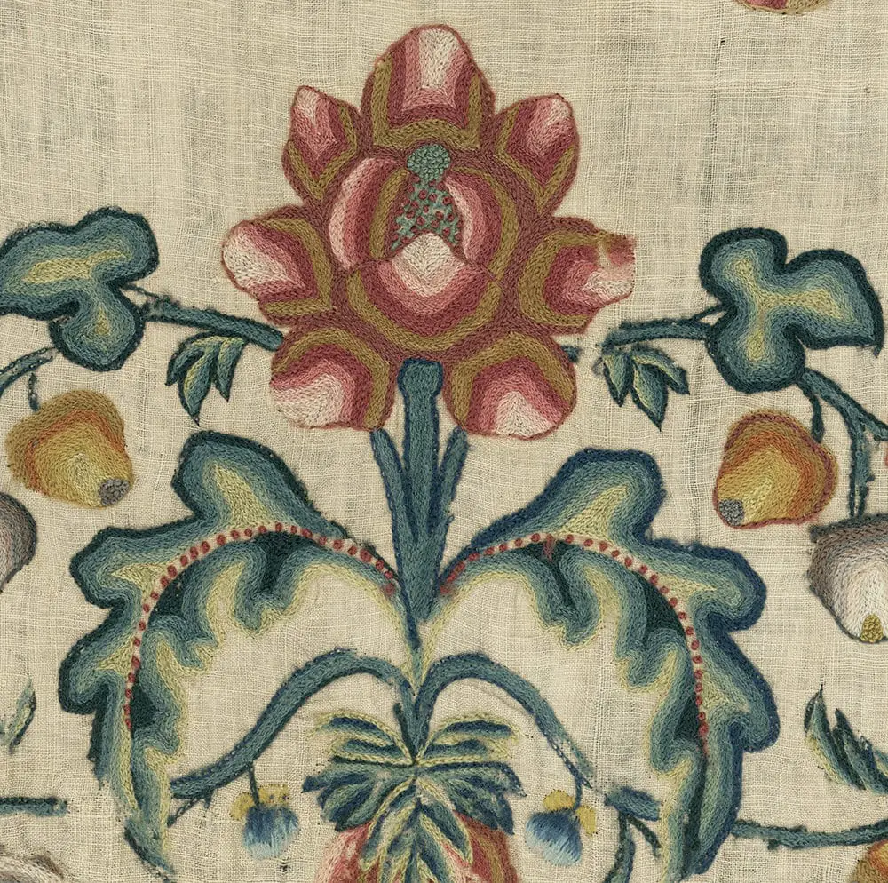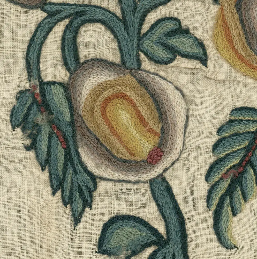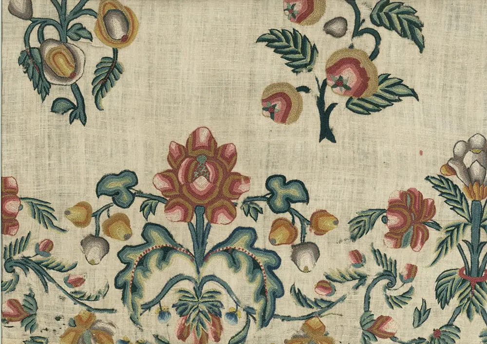 This embroidered valance showcases the "Point de Beauvais" style, also known as tambour or chain stitch. The fine linen ground is a light tan color. Originally collected by the esteemed Chicago textile collector and prominent architect Stanley Tigerman, it's in good condition, albeit with several minor wears and re-stitches in both the ground fabric and embroidery. Its dimensions are 16 inches by 40 inches (41 cm x 102 cm).