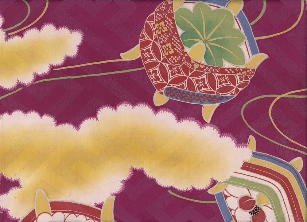 This stunning antique silk rinzu panel showcases a super shiny fuchsia dye, with equally bold bobbins in true shades of yellow, turquoise, red, spring green, and pink. This very soft silk also boasts a fantastic drape. It's in excellent condition, measuring 14.25 inches by 61 inches (36 cm x 155 cm).