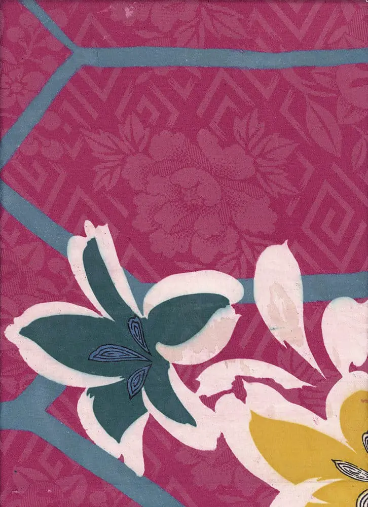 This fine and soft rinzu silk panel possesses a wonderful drape quality. While in very good condition overall, it does exhibit some patina and color migration stains, factors that have been taken into account in determining its price. It measures 14.75 inches x 62 inches (37 cm x 157 cm).