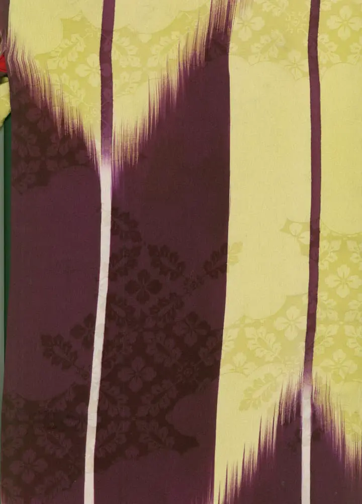 This rinzu silk kimono demonstrates a sophisticated reinterpretation of traditional Japanese textile techniques through modern silkscreen printing, creating faux kasuri patterns that mimic the irregular, feathered edges characteristic of ikat weaving. The design features bold yabane (arrow-feather) motifs arranged in striking vertical bands of deep burgundy against a golden yellow ground, with the distinctive zigzag edges that give arrow-feather patterns their name. This motif carries profound symbolic significance in Japanese culture, representing protection from evil, the ability to ward off negative influences, and the swift, direct path toward one's goals—making it a particularly auspicious pattern for kimono.