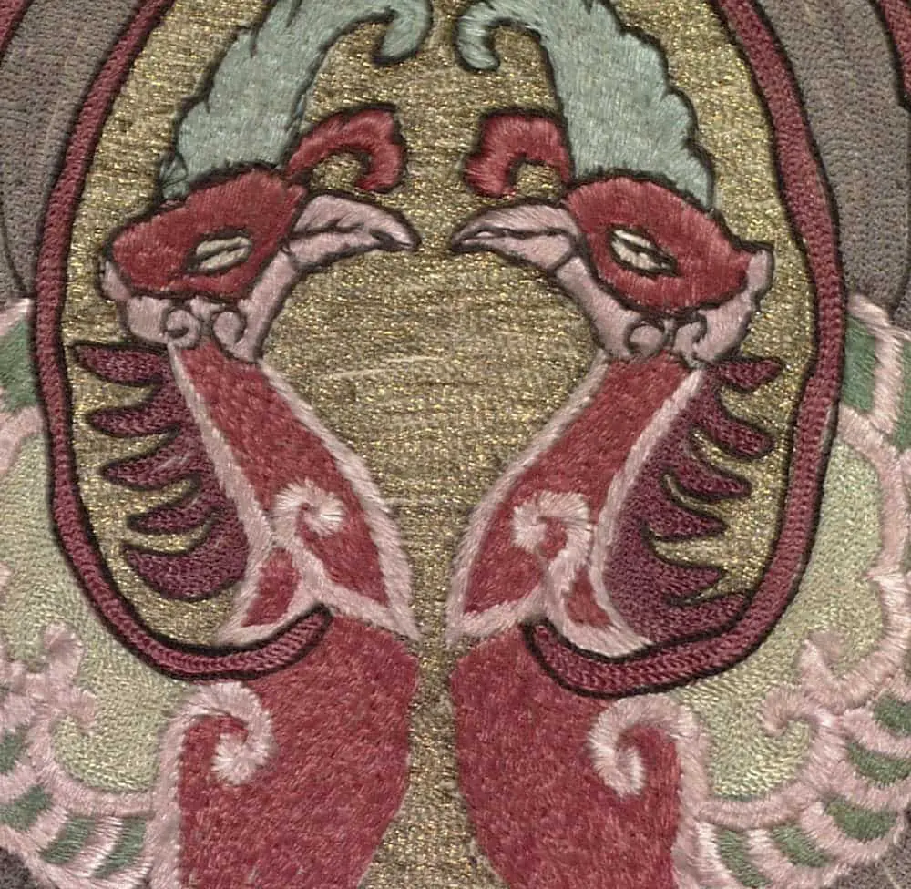 This unique textile features rare gold and silver metal embroidery alongside silk embroidery, complemented by a gold-threaded border. It lacks backing and potentially includes four original 1-inch brass rings along the top for hanging using a rod. Despite very slight overall wear, it's in excellent condition, measuring 25 inches by 35 inches (64cm x 89cm).