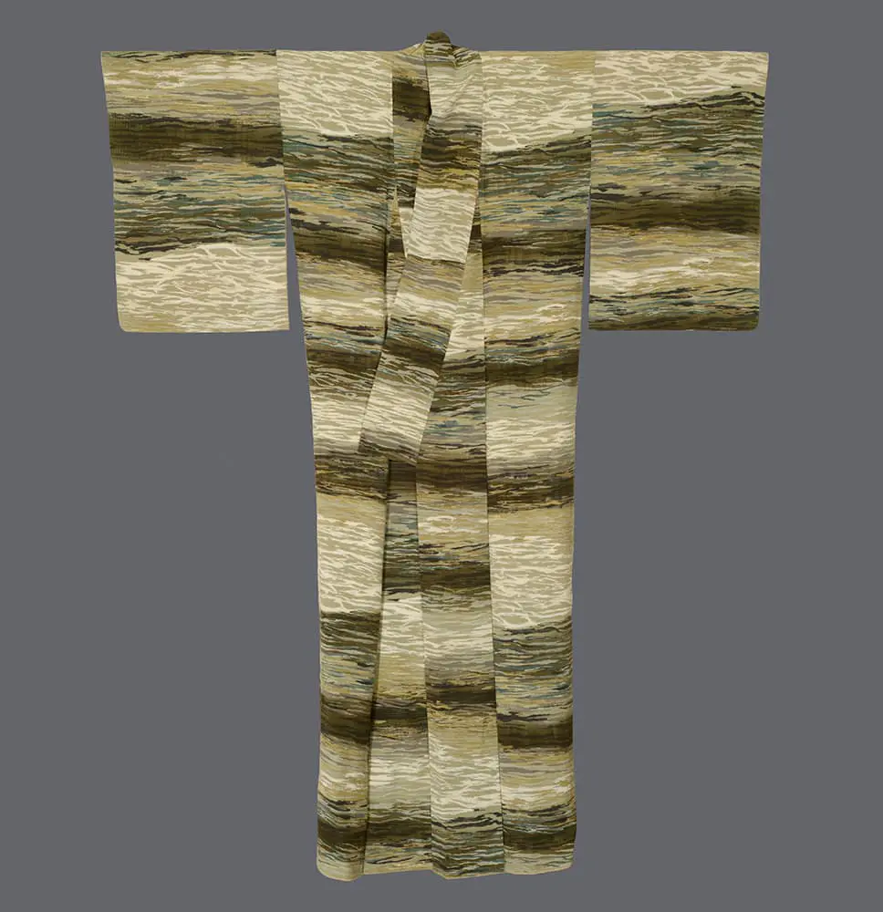 This silk kimono showcases abstract watercolor-like motifs, seemingly silk-screened with painted highlights. Its doura (inner upper lining) is made of polyester. Created by a kimono artist in a small workshop, it measures approximately 48 inches from sleeve-end to sleeve-end and 60 inches in height, or about 122 centimeters by 152 centimeters.