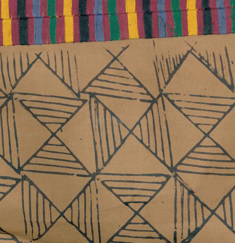 This large cotton 'Adinkra' Ashanti funeral shawl is composed of five panels stitched together using colorful threads. It's in very good condition, with just one tiny hole present. The shawl measures 67 inches by 87 inches (170 cm x 221 cm).
