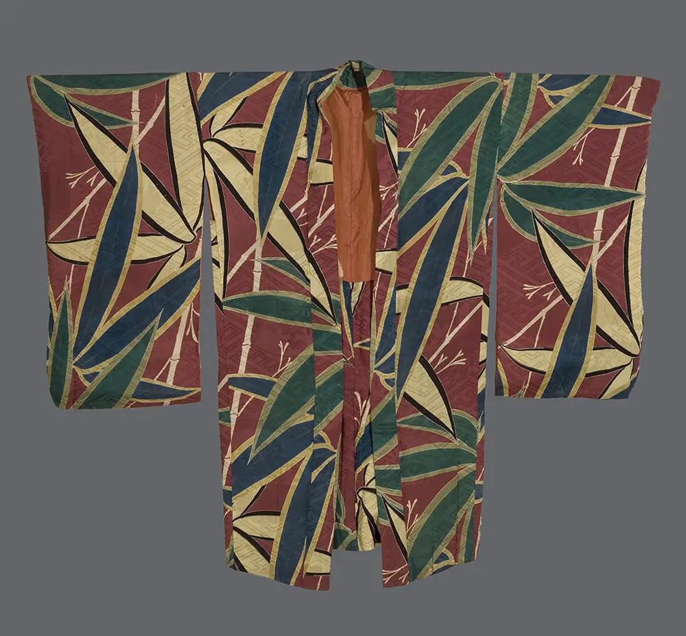 This haori features a vibrant and dynamic design dominated by stylized silkscreened bamboo leaves, rendered in a palette of rich, saturated colors that create a powerful visual impact. A deep, warm red background serves as a dramatic canvas for the leaf motifs. The bamboo leaves are depicted in a range of bold colors, including greens, navy blue, and pale yellows. The rinzu silk base fabric adds a subtle textural element, creating a play of light and shadow that enhances the richness of the colors and the overall luxurious feel of the garment.
