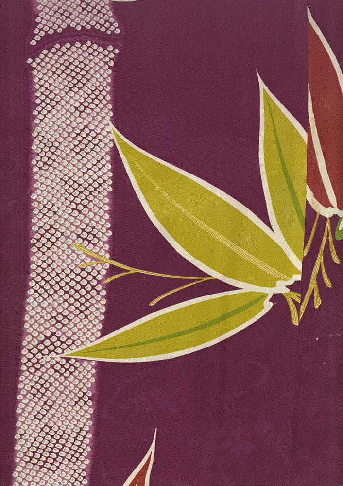 This elegant rinzu silk kimono displays a rich burgundy ground, providing a luxurious foundation for the stylized bamboo leaves, which are rendered in a naturalistic palette of golden yellows, warm oranges, and crisp whites that capture the seasonal transitions of this symbolic plant. The composition evokes similarities to both the Mingei folk craft movement, with its emphasis on functional beauty, and contemporary Western decorative arts, particularly in the way the bamboo motifs are abstracted into bold, graphic forms that maintain their organic essence while serving purely ornamental purposes.