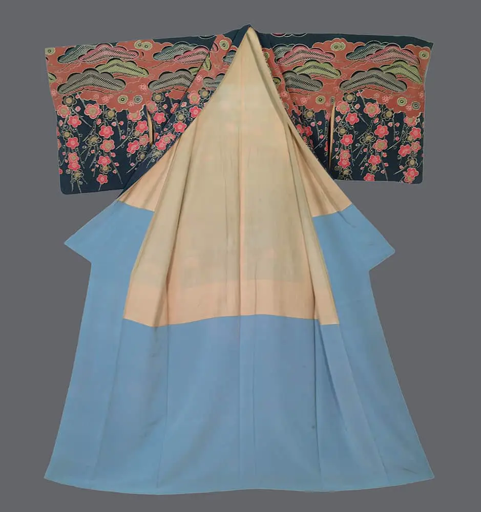 The cultural significance of this kimono extends far beyond its aesthetic achievement. Created during the traumatic period of cultural assimilation following 1879, when the Ryukyu aristocracy was disbanded and Okinawan cultural practices were actively suppressed, this garment likely served as a form of cultural resistance for a wealthy Okinawan woman navigating her new identity within the Japanese empire. The subtle incorporation of pale blue silk lining, traditionally reserved for Ryukyu aristocracy, functions as a discreet homage to the former kingdom's color hierarchies. The motifs themselves carry layered meanings: while the cherry blossoms align with Japanese seasonal aesthetics, the specific color combinations maintain distinctly Okinawan characteristics that would have been recognizable to those familiar with bingata traditions, creating a visual language of cultural memory embedded within apparent conformity to Japanese imperial aesthetics.