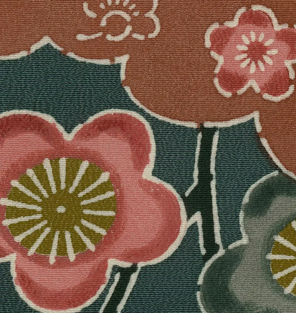The technical achievement of this piece lies in its masterful adaptation of traditional bingata stenciling and resist-dyeing techniques to create a design that superficially resembles contemporary Japanese kimono patterns. The bingata process, which developed through centuries of cultural exchange with China, India, and Java, employed complex layered stenciling methods that allowed for the intricate color gradations visible in the pine tree and floral motifs. The coral-pink ground of the upper section transitions seamlessly into the deep teal-green body, demonstrating the sophisticated color theory that bingata artisans had perfected by this period. The resist-dyed cherry blossoms scattered across the composition show the characteristic soft edges and subtle color bleeding that distinguish bingata from other Japanese dyeing methods.