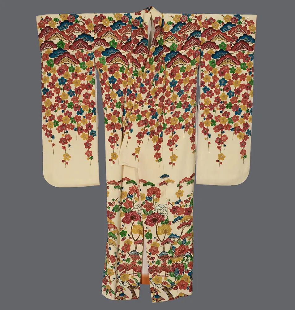 This furisode represents a fascinating synthesis of traditional Japanese textile artistry and mid-20th century aesthetic sensibilities, executed on luxurious chirimen silk with its characteristic crepe texture. The garment showcases a masterful application of bingata techniques—the distinctive Okinawan resist-dyeing method that produces the bold, saturated colors and crisp motif boundaries visible throughout the design. This technique, historically associated with royal Ryukyu Kingdom textiles, creates the vibrant palette of deep burgundy, emerald green, navy blue, golden yellow, and coral that dominates the composition.
