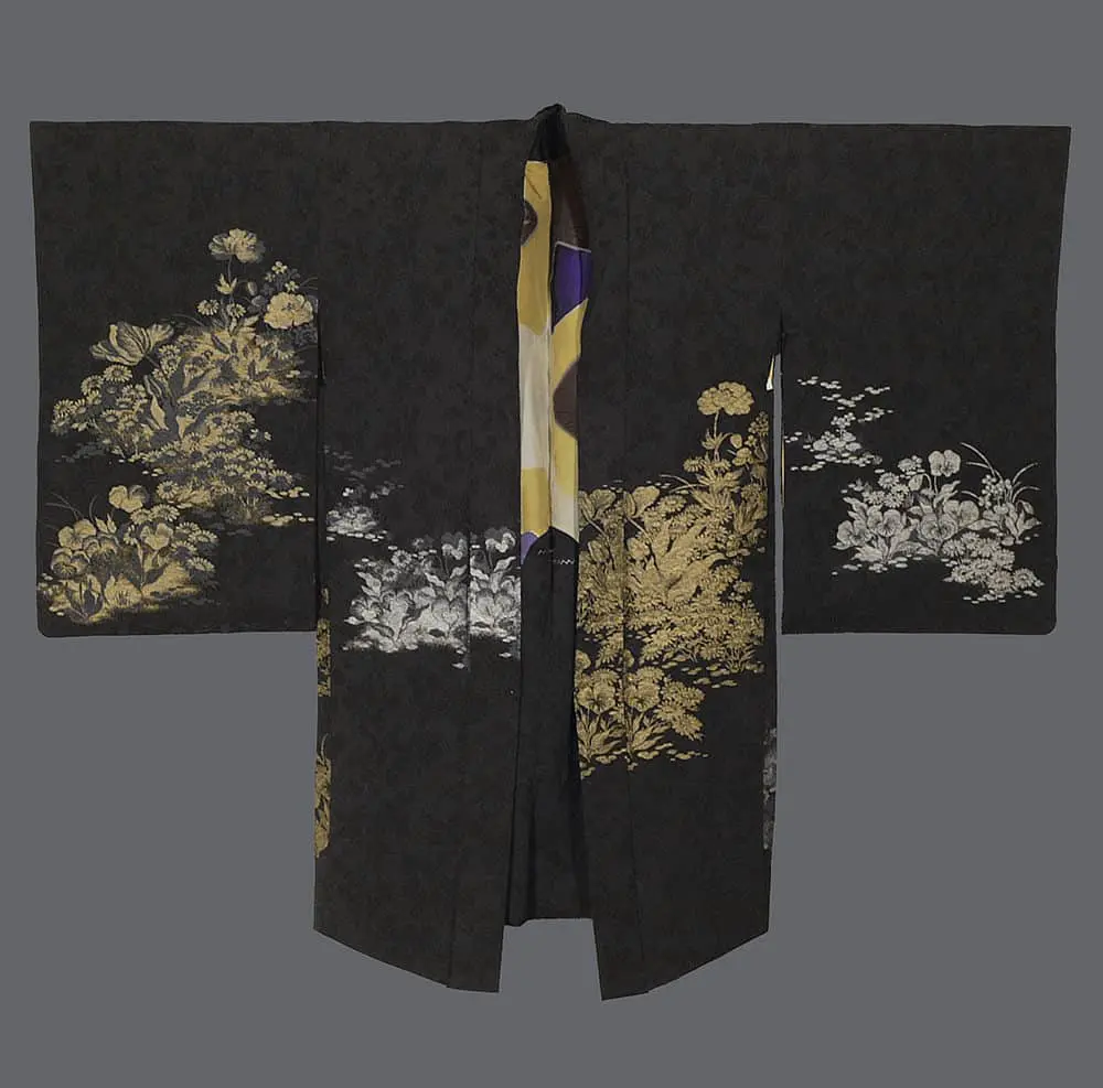 The artistic style is deeply rooted in traditional Japanese aesthetics, particularly the Rinpa school, known for its bold compositions, stylized natural motifs, and lavish use of gold and silver. The elegant lines, balanced composition, and metallic threads reflect Rinpa influence. The haori also embodies miyabi, a traditional ideal of courtly elegance and refinement, evident in the luxurious materials and intricate details. While primarily drawing from Japanese tradition, one might find a subtle affinity with the decorative aspects of Art Nouveau, particularly in the organic lines of the floral motifs. However, the haori's aesthetic remains distinctly Japanese.