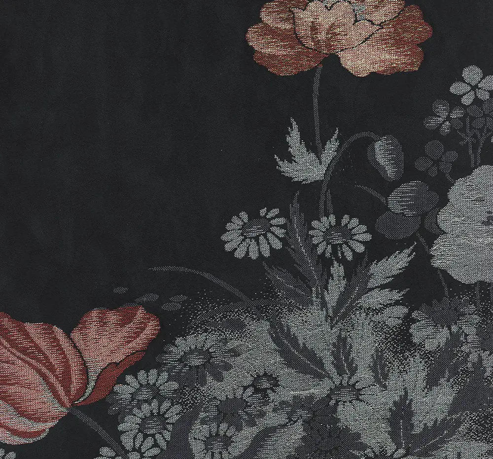 Against the haori's rich, black figured silk background, an asymmetrical arrangement of floral motifs creates a striking visual composition. The design showcases the skillful use of urushi (lacquer-coated) threads in red, pink, silver, and gold, adding luster and dimensionality. The sheen of these threads creates a beautiful interplay of light and shadow against the black background, enhancing the vibrancy of the flowers.