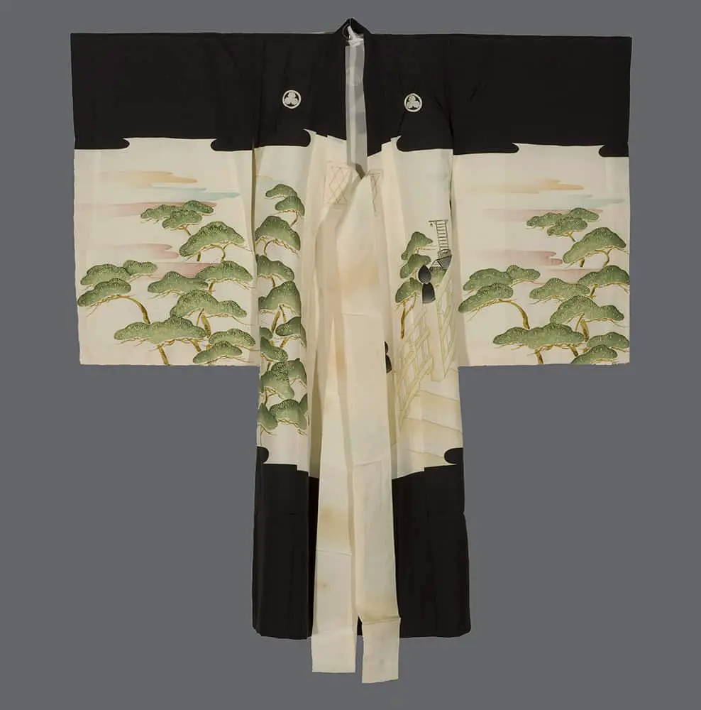 This boy's plain silk miyamairi kimono is designed for a ceremonial Shinto shrine blessing. It features a depiction of a children's daimyo procession, reminiscent of Edo times, crafted using yuzen-dyeing techniques with highlights of metallic embroidery. Despite minor imperfections, the kimono is in good condition and measures 27 inches (68.6 cm) from sleeve-end to sleeve-end and 39 inches (99.1 cm) in height.