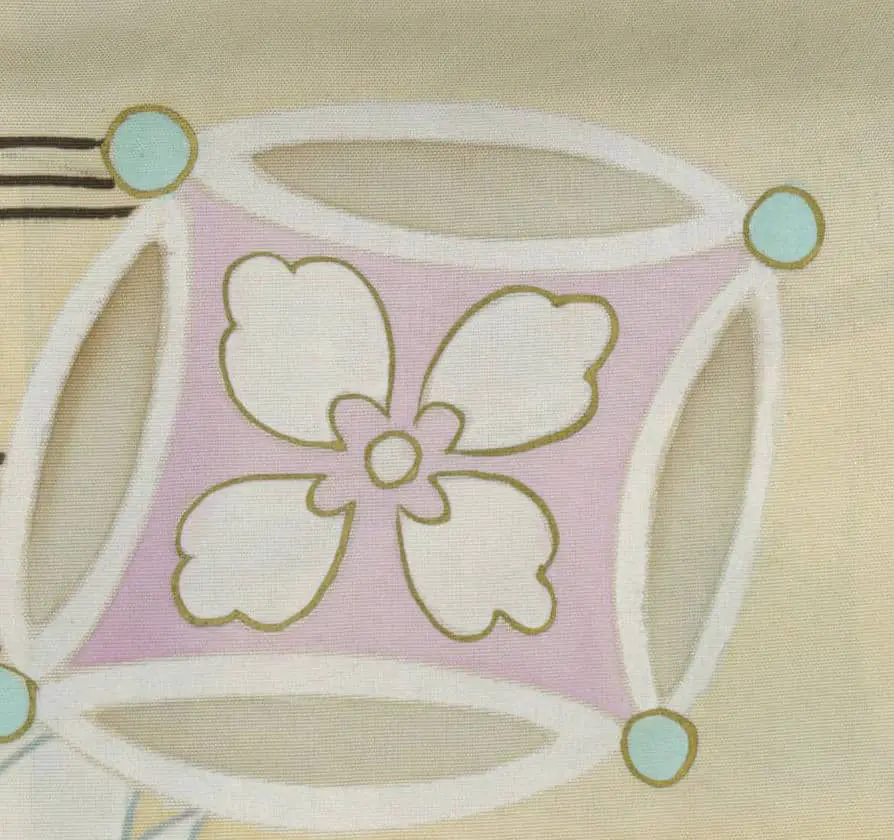 The treasure cart itself serves as both literal subject and symbolic vessel, representing prosperity, good fortune, and the accumulation of spiritual and material wealth - themes particularly significant for a boy's ceremonial garment intended to invoke blessings for future success. The radiating wheel spokes create dynamic geometric patterns that echo the sunburst motifs popular in Art Deco design, while the swirling clouds and atmospheric elements reflect the more organic, flowing lines associated with Art Nouveau aesthetics.