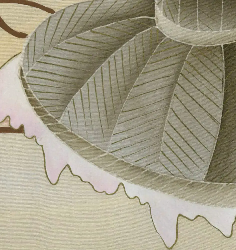 The color palette of deep forest greens contrasted with luminous cream, soft blues, and coral accents creates a harmonious yet vibrant visual experience. The scattered treasure objects - including scrolls, jewels, and ceremonial implements - are depicted with meticulous attention to detail, each carrying symbolic weight related to wisdom, prosperity, and spiritual enlightenment. The detail images reveal the remarkable technical mastery of the yuzen painting process, showing how individual motifs are carefully integrated into the overall compositional flow, with the cart's wheels serving as focal points that organize the surrounding decorative elements into a cohesive, celebratory narrative of abundance and auspicious fortune.