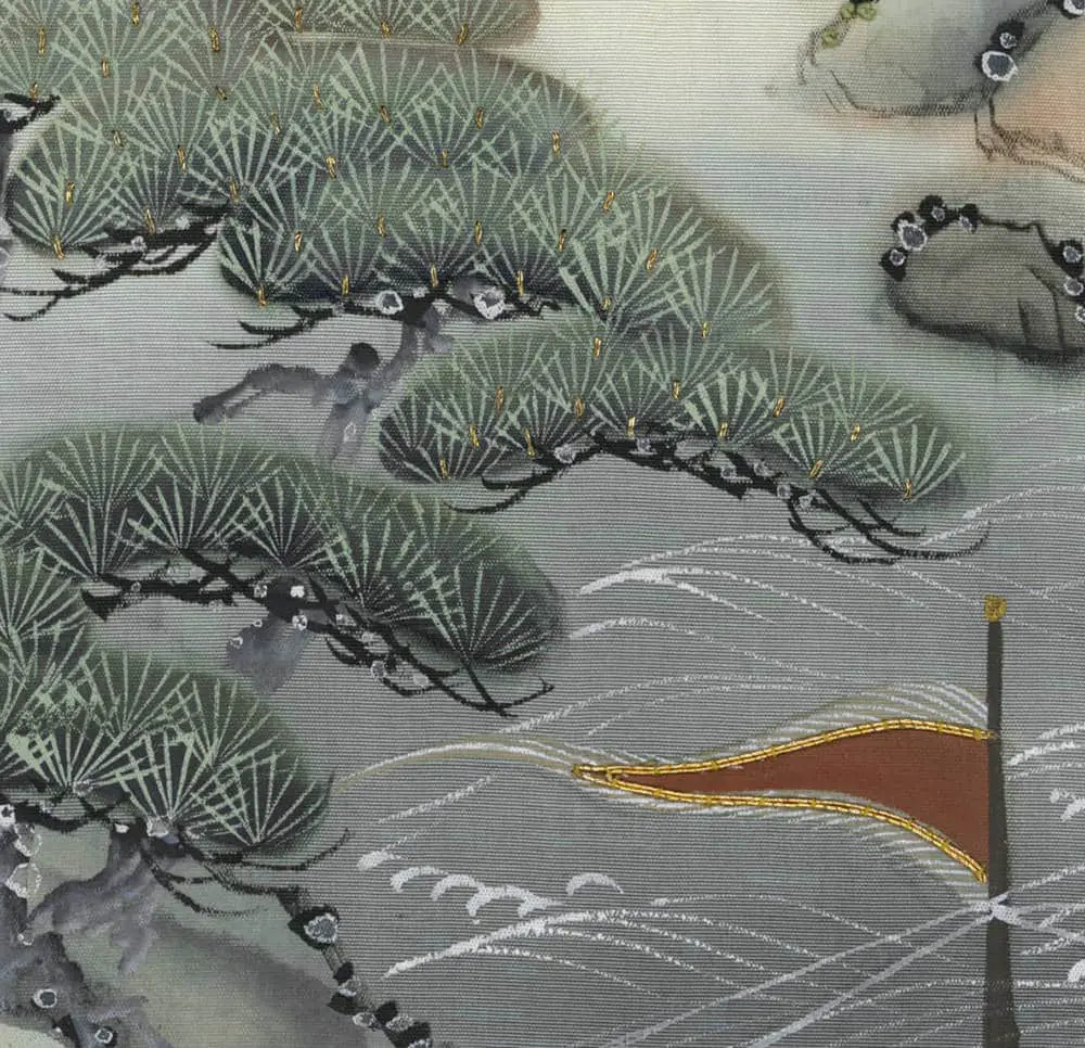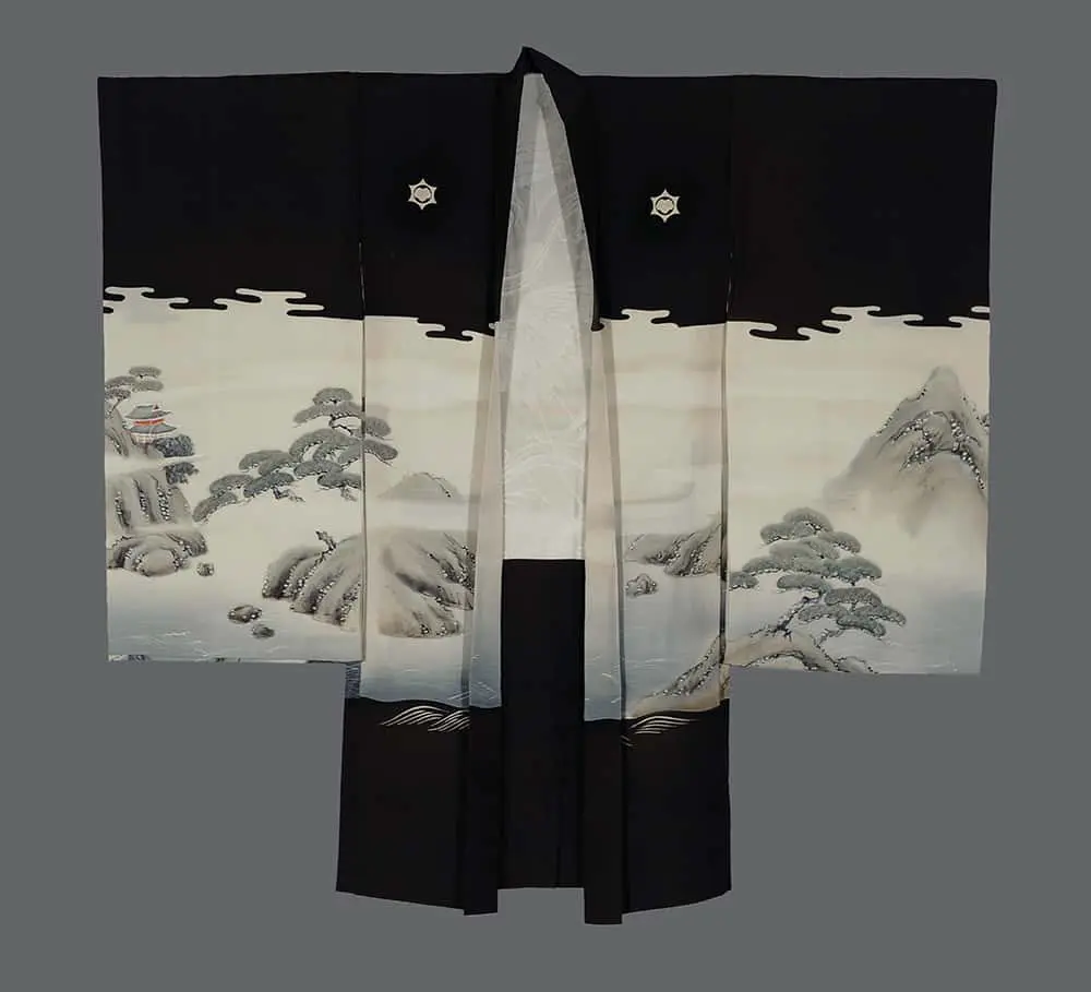 This exceptionally rare miyamairi haori represents a fascinating departure from traditional ceremonial formats, as such garments for Shinto shrine blessings typically take kimono form rather than the shorter haori jacket style. The elaborate composition unfolds as a sweeping landscape narrative that transforms the garment into a miniature painted scroll, featuring soaring cranes against a dramatic black sky punctuated by stylized clouds, while below, an intricate mountainous terrain reveals temples, pagodas, bridges, and a treasure ship navigating stylized waves at the hem. The sophisticated interplay of painting and embroidery techniques—including simple stitching, sagara knots, and couching work—creates remarkable textural variety that enhances the visual depth of this complex scene, with each architectural element rendered in meticulous detail that speaks to the highest levels of craftsmanship available during this golden age of Japanese textile arts.