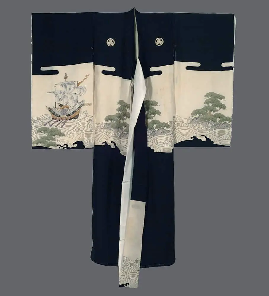 The choice of maritime themes for a child's ceremonial kimono reflects the optimistic internationalism of early 20th century Japan, when seafaring and global commerce represented adventure, prosperity, and cultural exchange rather than conflict. The juxtaposition of the sophisticated nautical imagery against the deep navy ground creates a sense of drama and movement appropriate for this celebratory garment, while the technical mastery evident in both the silk-screening and embroidery work demonstrates the high level of craftsmanship applied even to children's ceremonial wear. This piece embodies the era's spirit of looking outward while maintaining deep roots in traditional Japanese aesthetic principles.