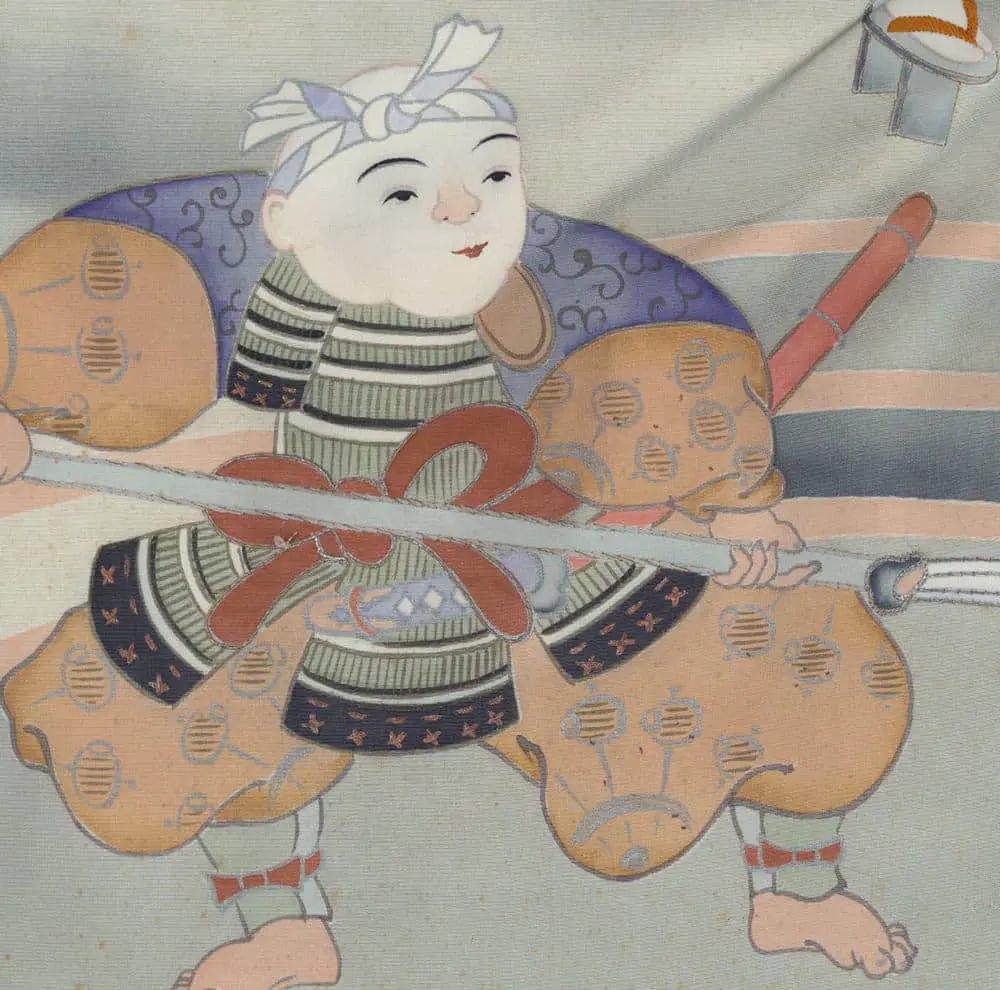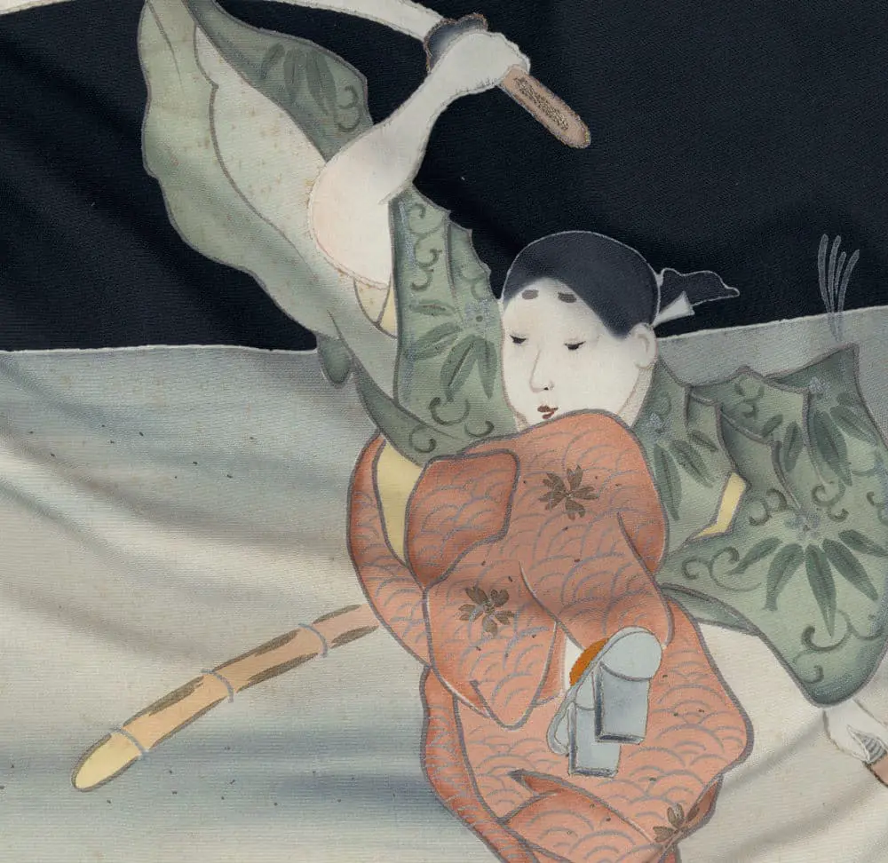This depiction of the legendary encounter on the kimono might be inspired by woodblock prints, with the positions of the characters resembling an 1854 Yoshifuji print. Notably, the fearsome nature of the scene is toned down to suit the sensibilities of a child, portraying a young and headstrong Yoshitsune displaying courage and valor in the face of adversity.