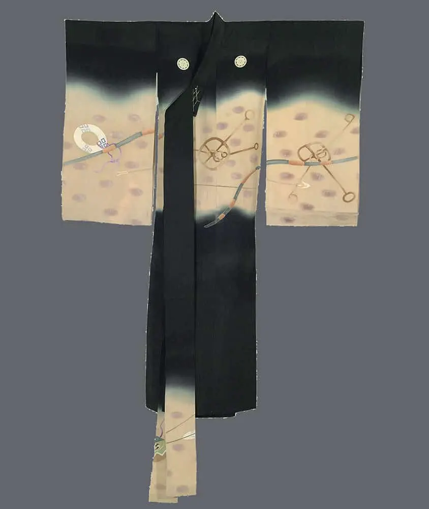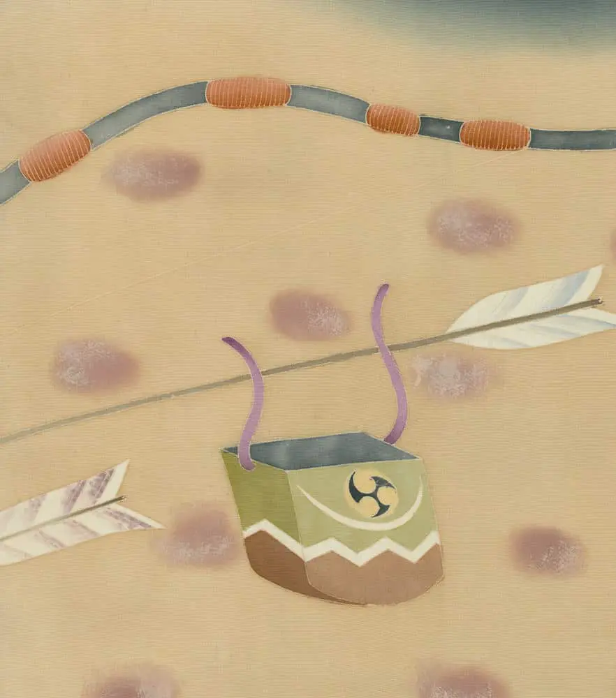 The kimono features a composition of auspicious motifs associated with archery and protective symbolism. At its center is a green horagai, or conch shell trumpet, traditionally used by yamabushi ascetics and in Buddhist ritual, evoking spiritual authority and the power to summon divine presence. Flowing across the garment are a quiver of arrows, scattered arrows, and an archery armguard, all referencing samurai culture while symbolizing strength, vigilance, and protection. A small suspended container completes the martial theme, tying the imagery to equipment of the warrior class and reinforcing wishes for success and safeguarding. The yuzen technique allows for these symbolic elements to appear to float dreamlike across the garment's surface, creating a visual prayer for the child's spiritual protection and future prosperity.