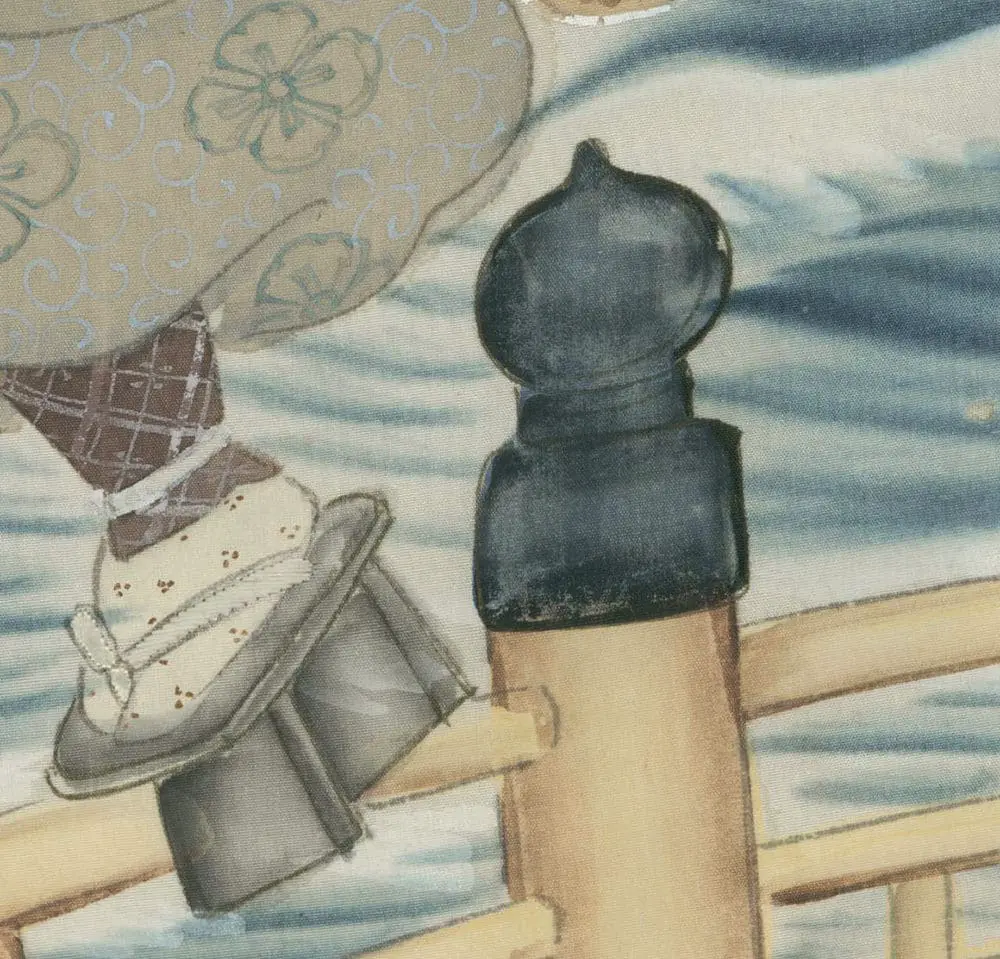 The Gojo Bridge folktale depicted on this kimono revolves around two revered historical figures turned legends. The first is Benkei, a Japanese warrior monk who transitioned from a Buddhist monastery to become a 'yamabushi', recognized by their black caps. The second figure is Minamoto no Yoshitsune, son of the warlord Minamoto no Yoshitomo. Illustrated on this kimono, Benkei positioned himself at Gojo Bridge in Kyoto, disarming every passing swordsman, amassing 999 swords. On his 1000th duel, Benkei was defeated by Minamoto no Yoshitsune and thereafter became Yoshitsune's retainer. Benkei is intricately painted on this miyamairi kimono, while Minamoto no Yoshitsune is symbolized by a sword, simplifying the image. This legend is fitting for a boy's kimono, symbolizing bravery and nobility, qualities parents wish for their sons. The painting exhibits remarkable detail, especially in the river waves, the bridge, and the carefully-rendered bamboo grass and flower motifs adorning Benkei's kimono and hakama.