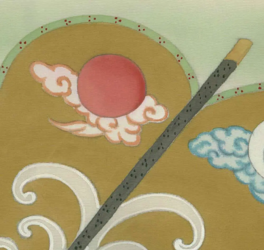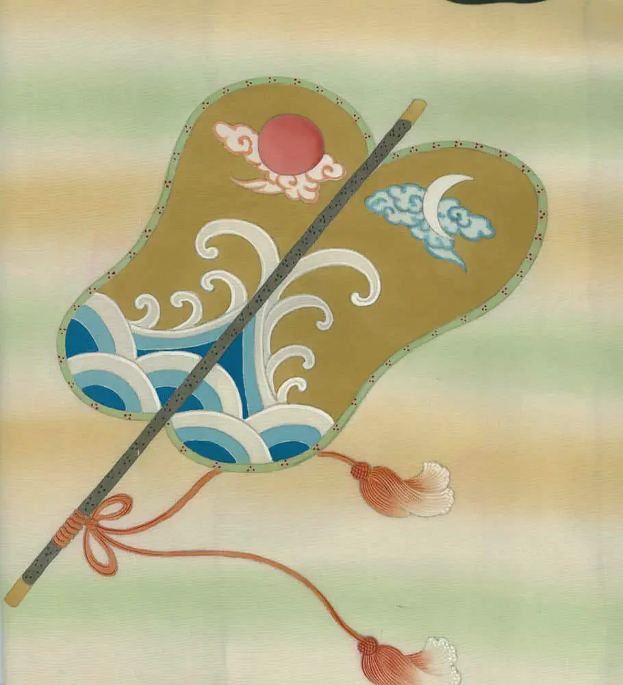 This miyamairi kimono represents the pinnacle of ceremonial textile artistry, designed specifically for the sacred Shinto ritual of a baby boy's shrine visit. The garment's sophisticated yuzen dyeing technique and freehand painting create a narrative tableau rich with symbolic meaning and cultural significance. The composition is dramatically structured with a bold black upper section that creates visual weight and formality, while the cream and pale green lower portion provides a luminous foundation for the elaborate motifs. This stark tonal division reflects traditional Japanese aesthetic principles of ma (negative space) and the interplay between density and emptiness.