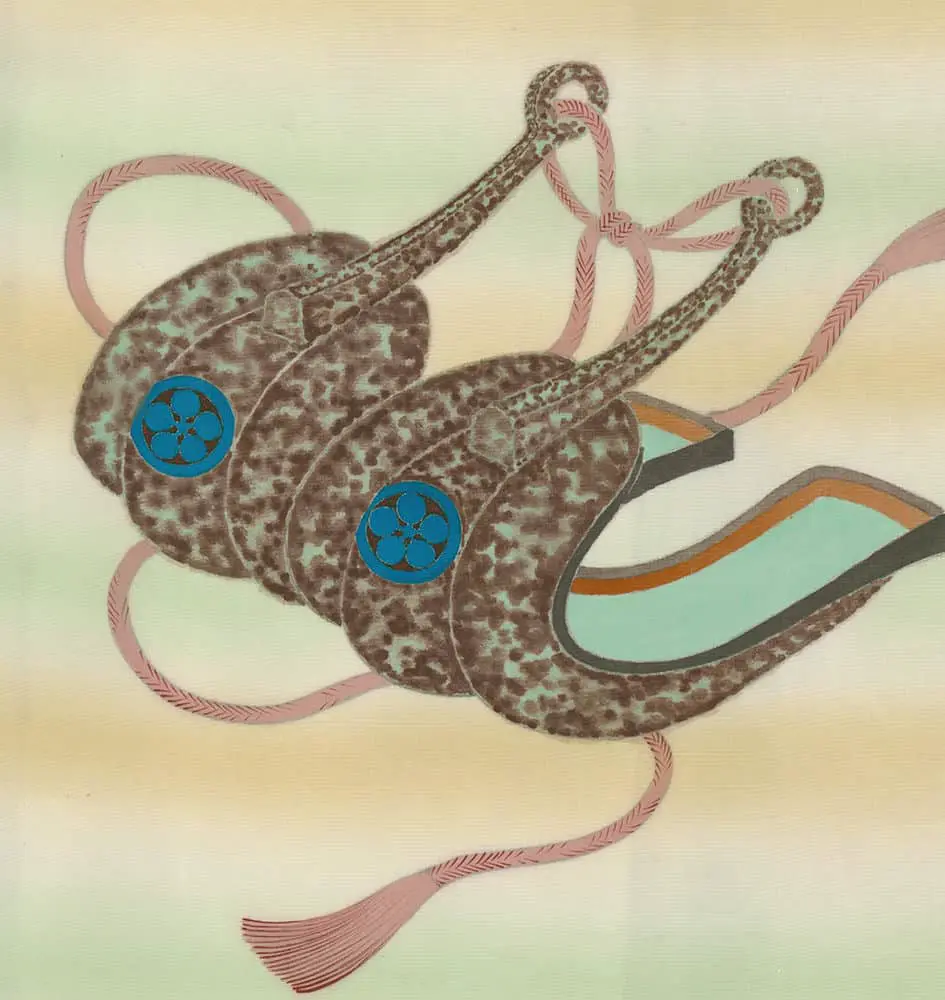 The central imagery revolves around classic symbols of masculine virtue and protection, most prominently featuring the kabuto (samurai helmet) as the focal point—a traditional emblem representing courage, honor, and the warrior's protective spirit watching over the child. The helmet's intricate detailing, with its characteristic maedate (front crest) and elaborate silk cords, demonstrates the masterful skill of yuzen artisans in rendering complex three-dimensional forms through textile art. Accompanying motifs include decorative fans and flowing ribbons that create visual movement across the composition, while the inclusion of doves introduces themes of peace and divine blessing. The stylized cloud formations and swirling decorative elements echo classical yamato-e painting traditions, creating a sense of celestial protection and auspicious fortune. This synthesis of martial symbolism with peaceful imagery reflects the Japanese cultural ideal of strength tempered by wisdom and compassion, making this kimono not merely ceremonial dress but a wearable prayer for the child's future character and destiny.