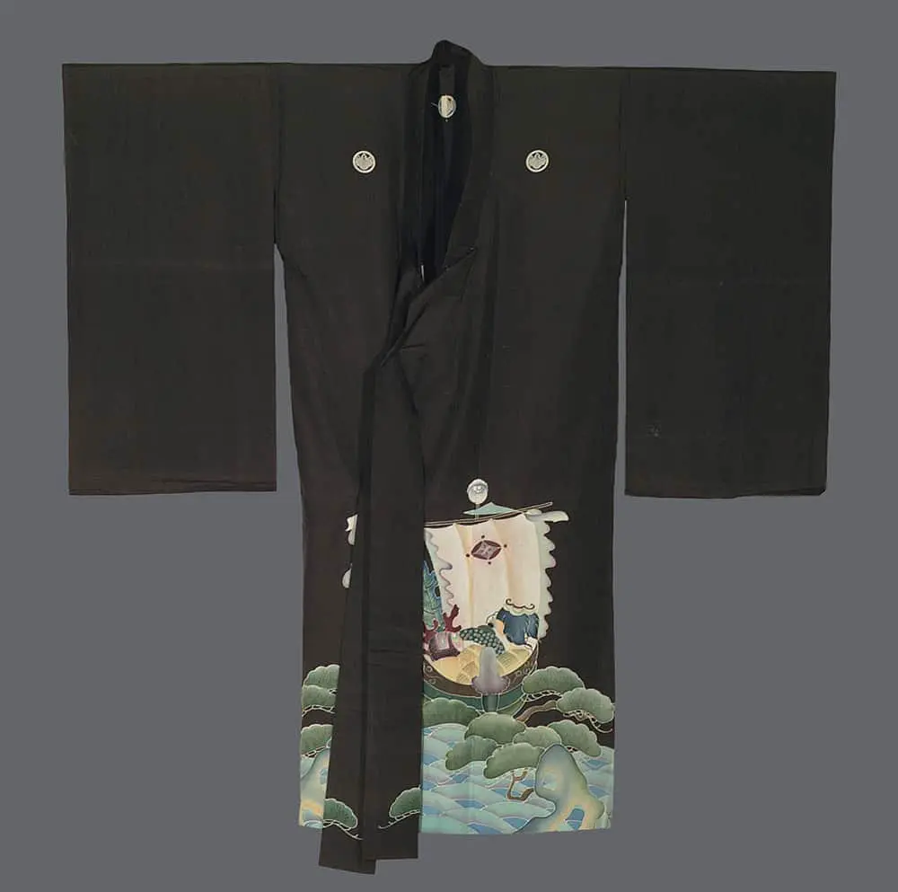 The technical execution demonstrates the period's synthesis of traditional hand-painting techniques with the more controlled yuzen resist-dyeing process, allowing for both precise geometric elements and fluid, naturalistic details within the same composition. The artist's mastery is particularly evident in the rendering of the treasure ships' contents, where individual objects are given distinct textures and colors while maintaining overall compositional harmony. The placement of decorative elements respects the garment's structure, with major motifs positioned to create visual anchors at key points while smaller details flow organically across seams and construction lines, creating a unified artistic vision that transforms functional clothing into ceremonial art worthy of life's most significant celebrations.