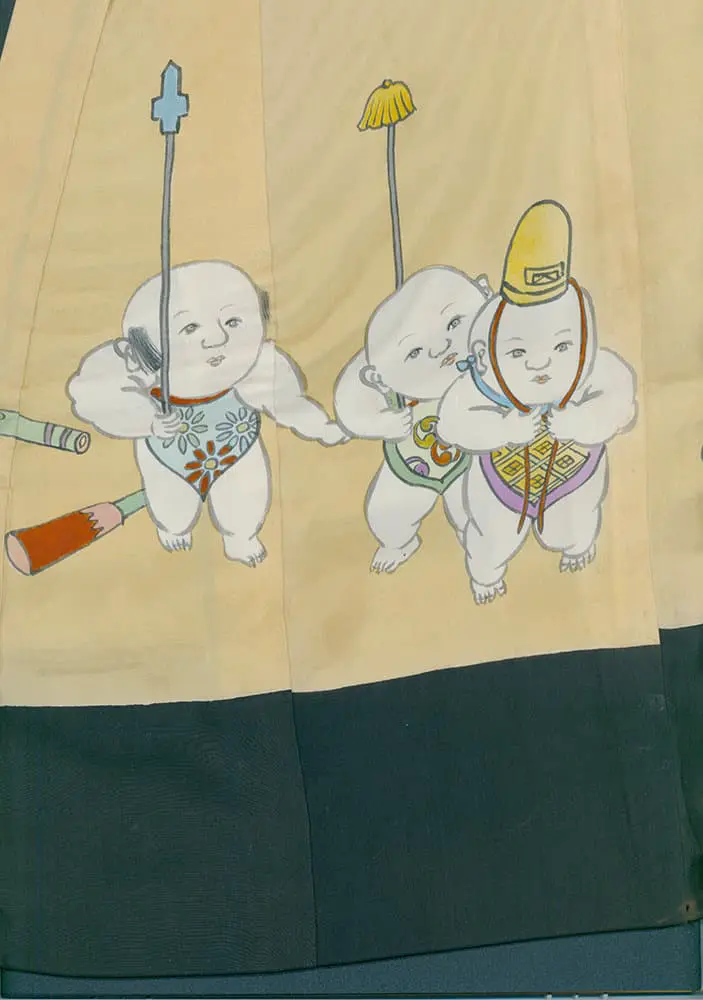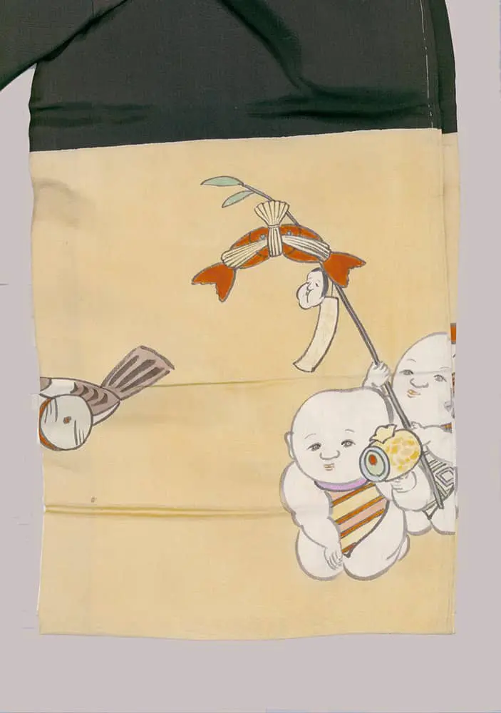 The technical execution combines the precision of yuzen resist-dyeing with delicate hand-painting to achieve subtle gradations in skin tones and fabric details. The positioning of these playful scenes within the cream-colored band ensures maximum visibility when the garment is worn during the ceremonial presentation at the shrine, while the surrounding black silk provides visual weight and formal dignity appropriate for such a sacred occasion. This miyamairi kimono thus functions as both protective talisman and artistic celebration, invoking blessings of joy, prosperity, and healthy development for the newborn child through its charming imagery and masterful craftsmanship.