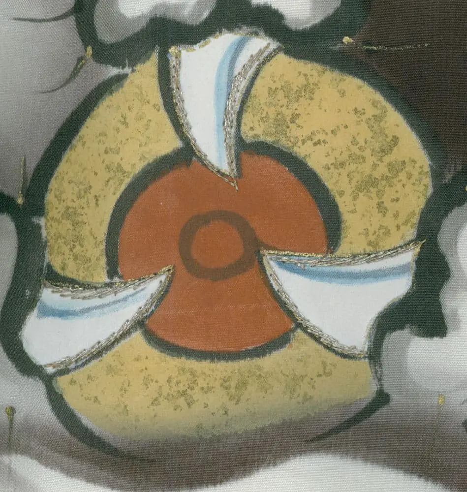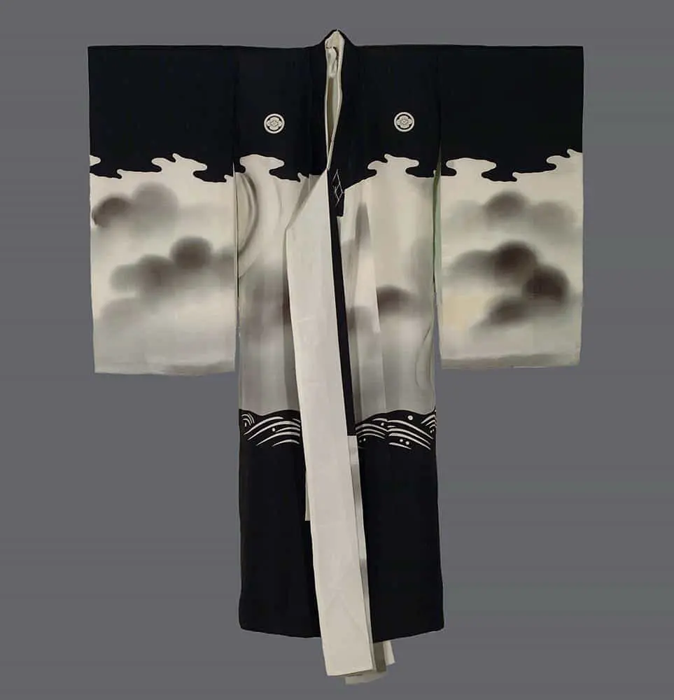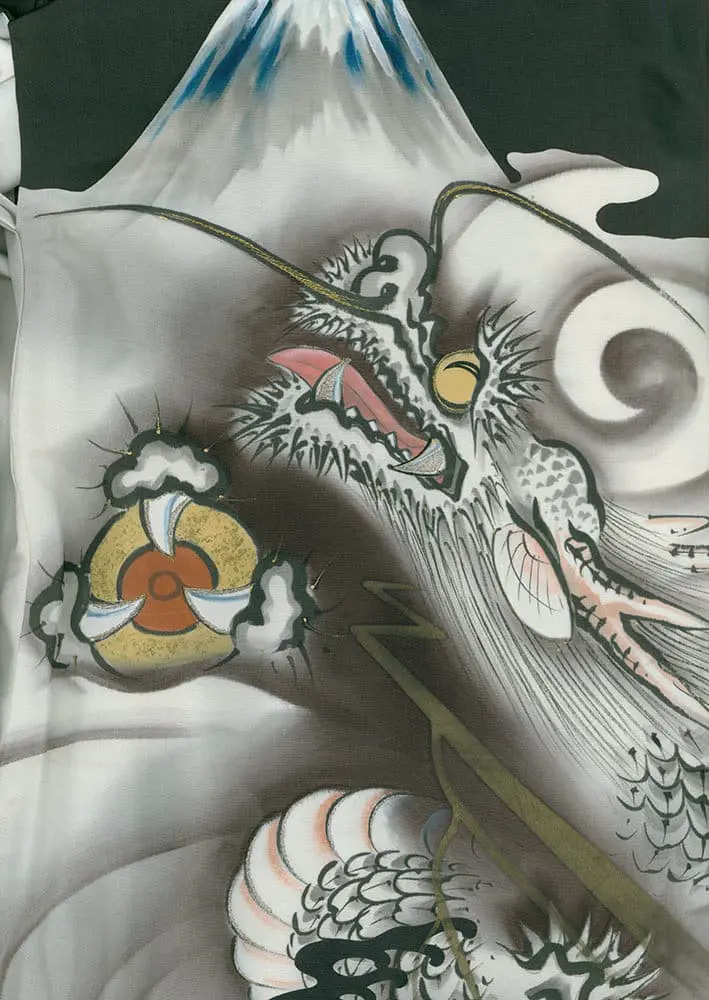 The composition reveals influences from both traditional Japanese screen painting and the ukiyo-e woodblock print tradition, particularly in its bold use of negative space and the dramatic contrast between the dark upper realm and the turbulent waters below. At the kimono's base, stylized waves rendered in white against black fabric echo the famous seigaiha (blue ocean waves) pattern, creating visual rhythm and suggesting the primordial waters from which the dragon emerges. The combination of freehand painting with silkscreen techniques allows for both expressive, fluid brushwork and precise decorative elements, while metallic embroidery adds luxurious dimensionality to key details. This ceremonial garment thus transforms the wearer into a canvas for one of Japan's most potent mythological narratives—the dragon's ascension representing spiritual elevation and the promise of a prosperous, powerful future.