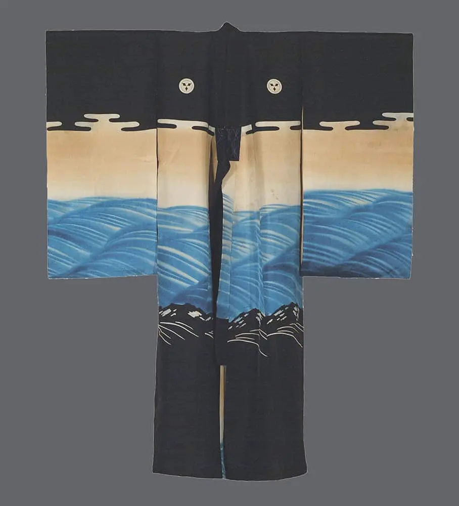 The artistic execution demonstrates a sophisticated understanding of traditional Japanese painting principles, with the composition flowing seamlessly across the garment's surface in a manner reminiscent of classical scroll paintings and the dynamic movement found in ukiyo-e prints. The powerful diagonal thrust of the carp's body creates dramatic tension, while Kintaro's determined expression and muscular form showcase the artist's skill in figure painting. The use of bold contrasts—the deep navy background against the luminous blues and whites of the rushing water, punctuated by the warm earth tones of the landscape elements—creates a visual impact that recalls both the dramatic chiaroscuro effects of late Edo period art and the emerging modern sensibilities of the Showa era.