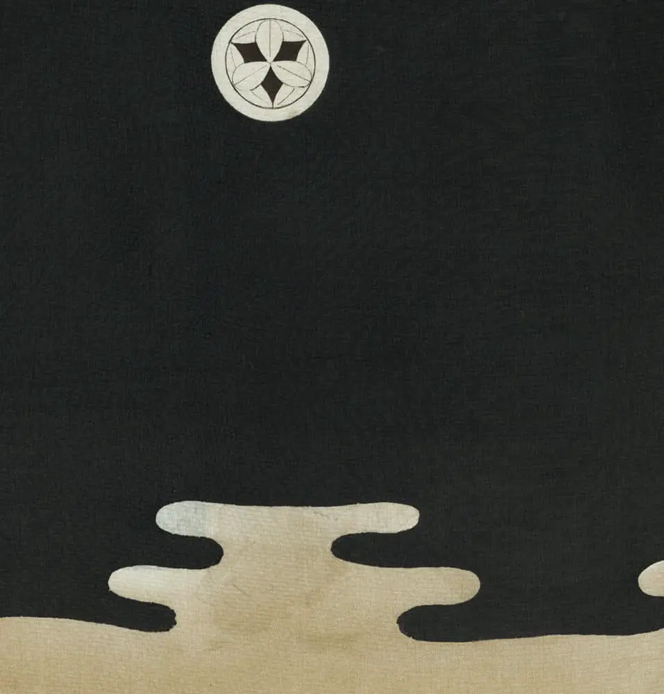 Symbolically, this kimono operates on multiple levels of meaning appropriate for a child's ceremonial garment. Kintaro, known for his supernatural strength and his ability to communicate with animals, represents the ideal of natural power harmoniously channeled, while his victory over the carp (a symbol of perseverance and eventual transformation) suggests the child's potential to overcome life's challenges and achieve greatness. The circular family crests (mon) positioned at the shoulders and chest anchor the mythological narrative in familial identity, while the inclusion of pine trees and flowing water adds layers of auspicious symbolism representing longevity and adaptability.