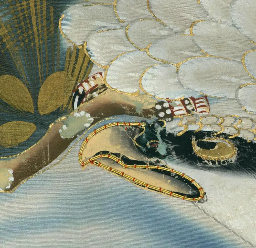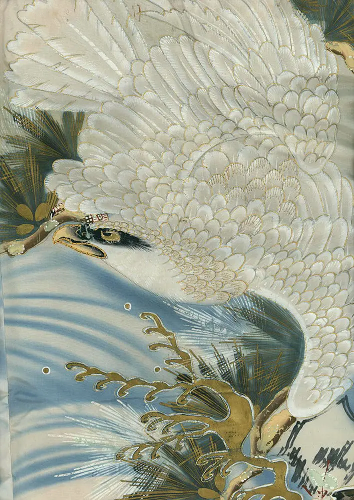 This fine silk miyamairi kimono, worn during ceremonial anointment at a Shinto shrine, showcases a large white hawk motif that has been meticulously hand-painted. Despite minor imperfections, it remains in very good condition. Measuring approximately 40 inches (102 cm) from sleeve-end to sleeve-end and standing at 40 inches (102 cm) in height, this kimono presents a striking depiction of a white hawk, symbolizing strength and grace in its ceremonial context.