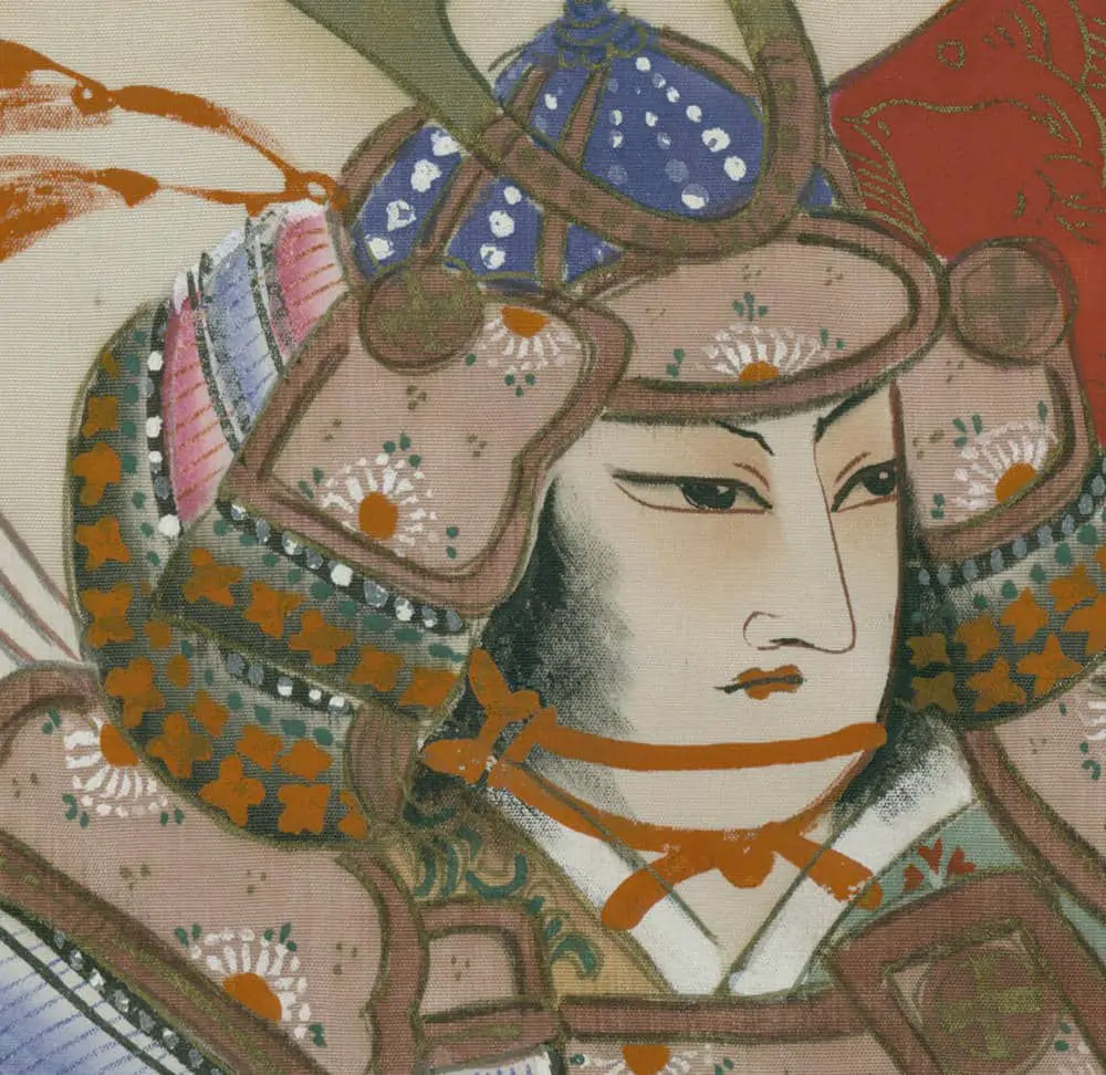 This fine plain silk miyamairi kimono is worn during the ceremonial coming-of-age anointment at a Shinto shrine. It features yuzen and painted motifs depicting a boy warrior, with the family crest area intentionally left blank. Despite small imperfections, it remains in very good condition. The kimono measures approximately 34 inches (86 cm) from sleeve-end to sleeve-end and 37 inches (94 cm) in height. Its portrayal of a boy warrior adds a sense of strength and tradition to this ceremonial garment.