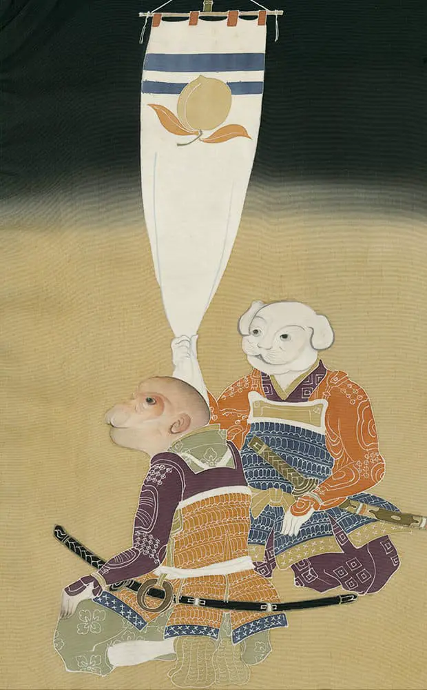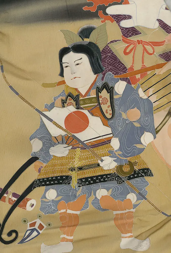 The miyamairi silk kimono displays a richly painted yūzen scene of the folk hero Momotarō, accompanied by his animal allies—the dog, monkey, and pheasant—who aided him in his quest to defeat demons (oni). In this design, Momotarō is shown in warrior attire, with his companions rendered beside a cart laden with treasure and symbolic items, suggesting the victorious outcome of his journey. The narrative is a popular subject for boys’ ceremonial kimono, embodying courage, loyalty, and triumph over adversity—qualities parents wished to instill in their sons at the moment of their first Shinto shrine blessing.