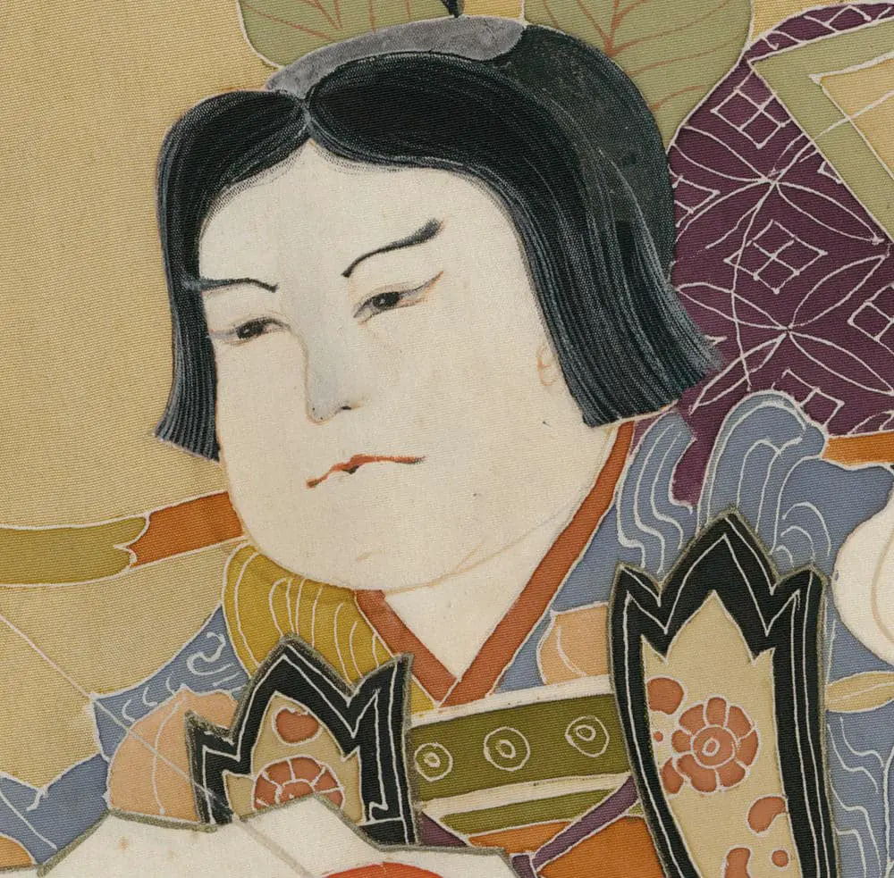 The design blends naturalistic figuration with stylized decorative elements, such as the rhythmic curves of the cart wheel and the bold placement of symbolic objects, aligning with the nihonga movement’s influence on textile art of the Taishō era. At the same time, the flattened spatial treatment and careful balance of figural and geometric motifs reflect Edo-period narrative art traditions, reinterpreted for early 20th-century ceremonial use.