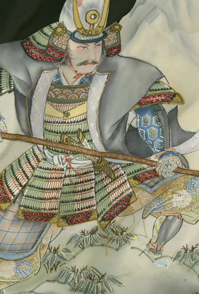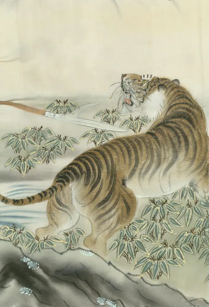 The artistic execution reflects the refined aesthetic sensibilities of the Meiji to Taishō periods, when Japanese artisans skillfully balanced traditional techniques with subtle modernizing influences. The color palette of muted earth tones, gold accents, and strategic use of negative space demonstrates the sophisticated restraint characteristic of Japanese design philosophy. The tiger, painted with bold strokes and naturalistic detail, contrasts beautifully with the geometric patterns of the warrior's armor, while the mountainous backdrop rendered in delicate gradations creates depth and atmosphere. The bamboo motifs scattered throughout the composition carry additional symbolic weight, representing flexibility, resilience, and moral integrity—qualities hoped to be instilled in the young boy who would wear this ceremonial garment during his Shinto blessing, marking his introduction to the protective spirits of the shrine and community.