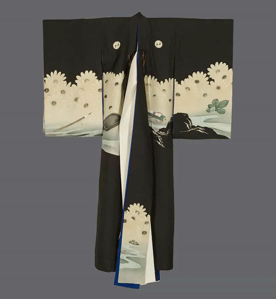 The technical execution demonstrates the height of Meiji period textile artistry, where traditional Japanese craftsmanship intersected with new influences and techniques. The yuzen dyeing technique allows for the subtle color gradations and fine pictorial details, while the sagara embroidery adds dimensional texture to key elements. The overall aesthetic evokes the refined sensibilities of the Rinpa school of Japanese decorative arts, with its emphasis on natural motifs, asymmetrical composition, and the integration of pictorial and decorative elements. The flowing, organic forms and the way the design wraps around the garment's structure also suggest influences from Art Nouveau, which was gaining international prominence during this period and finding expression in Japanese decorative arts of the early 20th century.