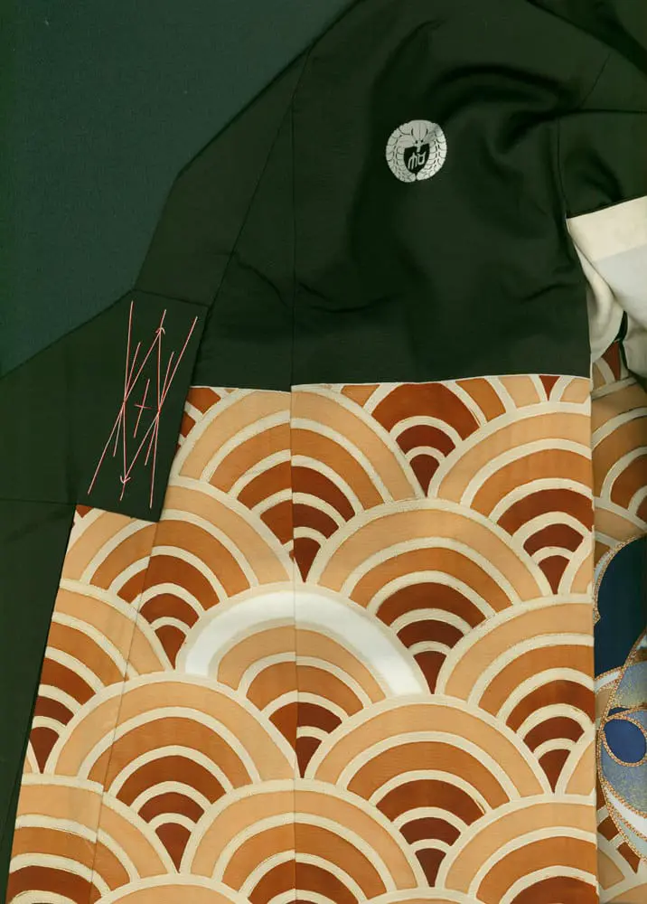 A boy's plain silk miyamairi kimono created for a ceremonial Shinto shrine blessing. The two motifs are waves and an intricately patterned lucky mallet. The waves and the mallet were created utilizing yuzen-dyeing (resist painting), with much metallic thread couching within the mallet motif. Very good condition, with minor imperfection on the outside, and lots of patina on the inner lining. 33" from sleeve-end to sleeve-end x 44" height. The mallet of luck is well known in Japan as the item that Daikoku, one of the Seven Lucky Gods, carries with him. Daikoku is the god of fortune and relationships. It is said that hitting the mallet of luck will cause any kind of wish to come true, and that Daikoku granted many wishes with it. It is also featured in many Japanese fairy tales.
