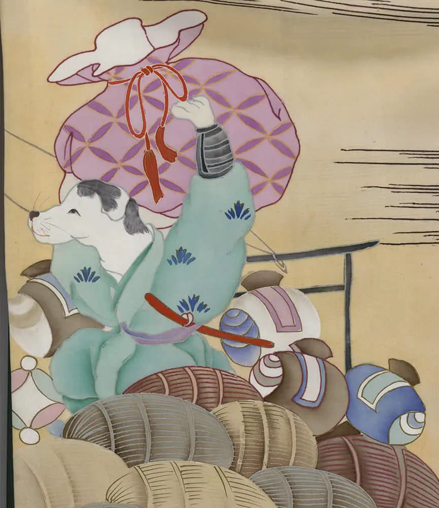 This ceremonial boy's kimono depicts the legendary Momotaro (Peach Boy) embarking on his heroic journey, accompanied by his faithful animal companions - the dog and monkey - who would later be joined by a pheasant in the complete tale. The composition is masterfully arranged to create a sense of adventure and movement, with the characters positioned as if caught in the midst of their quest to defeat the oni (demons) of Onigashima.