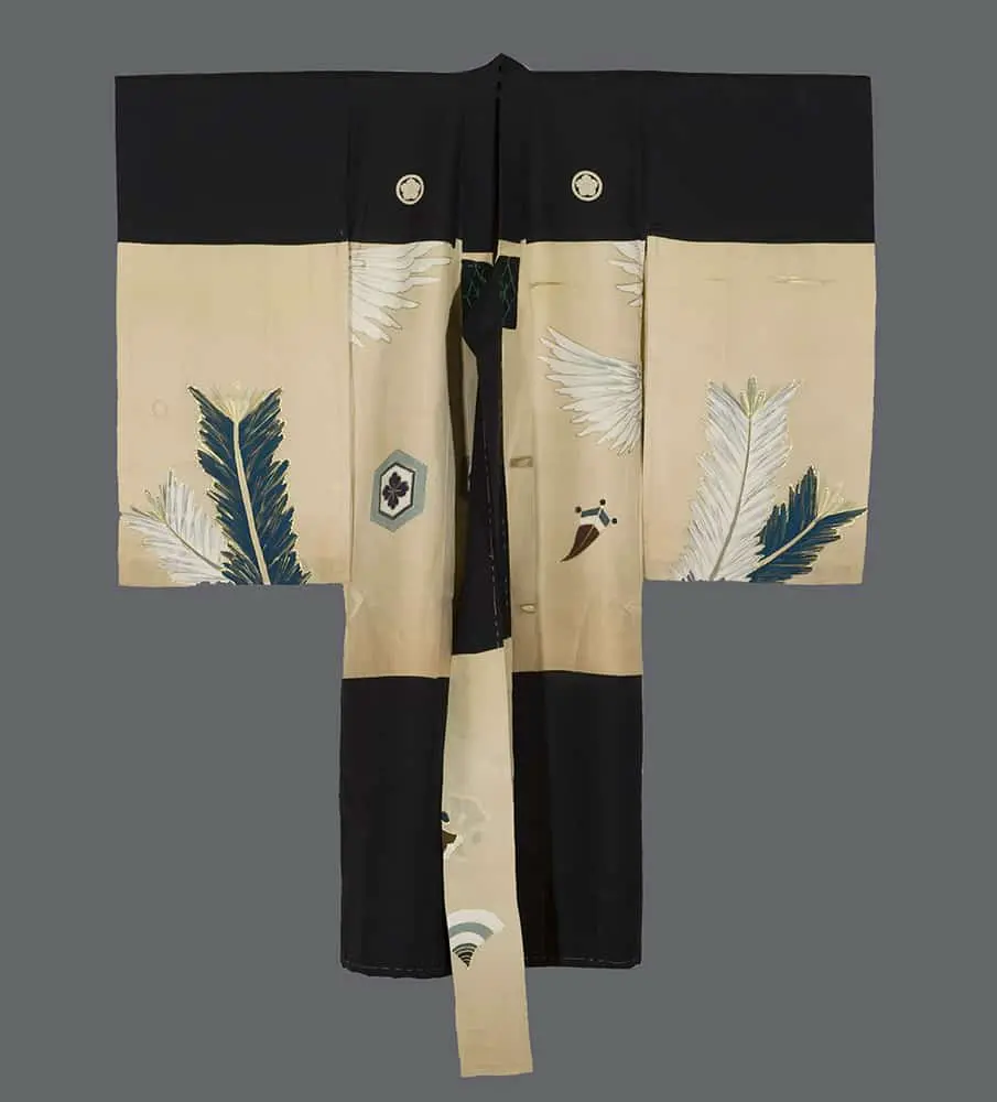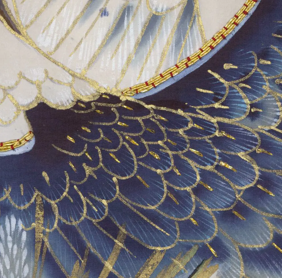 This boy's plain weave silk miyamairi kimono, tailored for a ceremonial Shinto shrine blessing, showcases two standing cranes with wings outstretched. These elegant motifs are crafted using a combination of painting, yuzen-dyeing, embroidery, and metallic couching techniques, adding intricate details. Overall, it's in very good condition with minor imperfections. Its measurements are 33 inches (83.8 cm) from sleeve-end to sleeve-end and 40 inches (101.6 cm) in height.