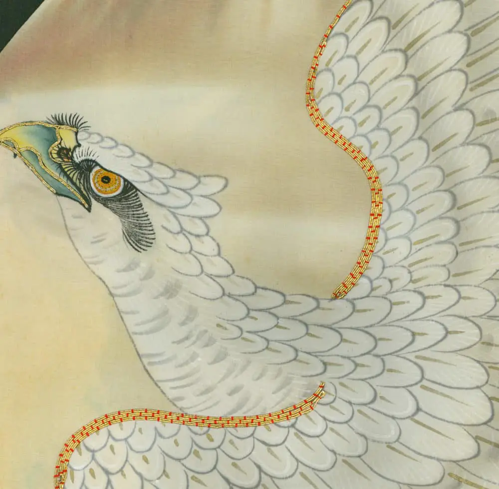 The artistic execution demonstrates the masterful yuzen-dyeing technique, evident in the subtle gradations and precise control of color application, particularly visible in the rendering of the falcon's detailed plumage and the rhythmic wave patterns. The waves themselves echo the iconic style popularized during the Edo period, reminiscent of Hokusai's "Great Wave," though rendered here with a more refined, aristocratic sensibility appropriate for ceremonial wear. Symbolically, this imagery is deeply auspicious for a young boy's blessing ceremony: the falcon represents strength, nobility, and keen vision—qualities hoped for in the child's future—while Mount Fuji embodies permanence, spiritual power, and Japan's cultural identity. The combination of these motifs with the formal black base of the kimono creates a garment that is both a work of art and a vessel for cultural transmission, embodying the Japanese aesthetic values of seasonal awareness, natural harmony, and the integration of spiritual symbolism into daily life.