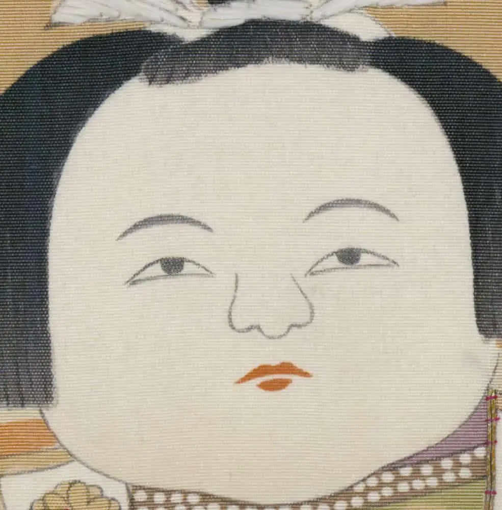 This miyamairi kimono presents a masterful study in contrasts, with the geometric precision of the brown and cream checkered pattern (gōshi) serving as both background and architectural framework for the central narrative elements. This grid-like structure evokes the traditional bamboo screens found in classical Japanese interiors, creating an intimate domestic setting that frames the heroic tale within a context of cultural continuity and familial warmth.