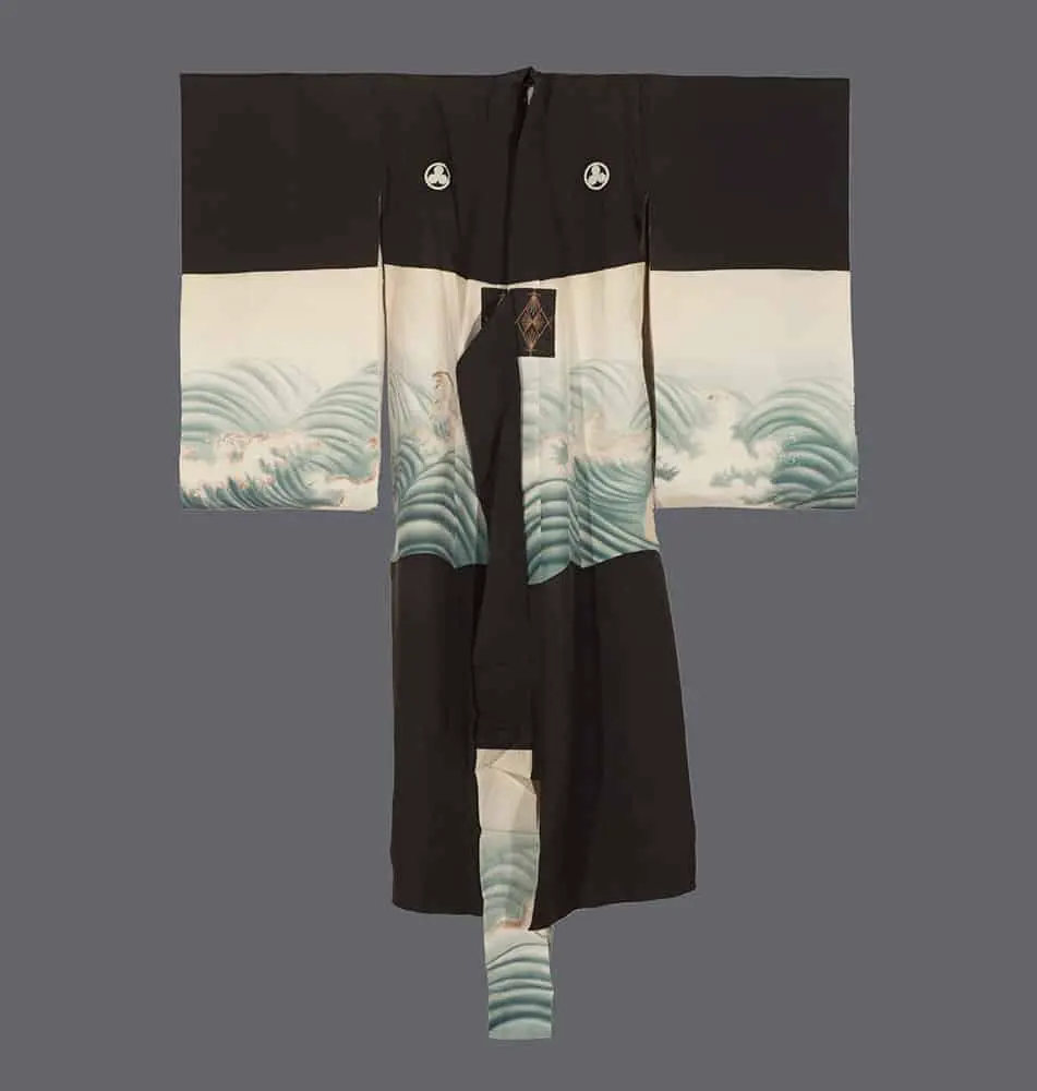 The artwork on this mid-20th-century boy's miyamairi kimono, designed for Shinto shrine dedication rituals, depicts a dynamic aquatic scene rendered with exquisite craftsmanship using yuzen resist dyeing for vibrant color gradients, sumi-e ink wash techniques for fluid shading, gold foil outlining to accentuate forms, and both simple and sagara embroidery for textured details. The composition centers on a majestic leaping carp, or koi, surging upward through stylized turquoise and white waves that evoke crashing foam and mist, symbolizing perseverance, strength, and transformation in Japanese culture—drawing from the legend of the carp ascending a waterfall to become a dragon, often associated with boys' growth and success, particularly resonant for Children's Day festivals. Accompanying the carp are elegant white cranes in flight, their wings outstretched against the black upper panels, embodying longevity, good fortune, and marital fidelity in traditional symbolism, while the overall design divides the garment into a stark black top half adorned with three circular family crests (mon) and a lighter lower section, creating a sense of dramatic ascent and balance. This piece evokes the aesthetic principles of the Rinpa school, a Japanese art movement from the Edo period emphasizing bold, decorative motifs and natural elegance with gold accents, blended with ukiyo-e influences in its wave patterns reminiscent of Hokusai's iconic "Great Wave," though adapted here in a post-war context for ceremonial childrenswear that fuses historical motifs with modern textile artistry.