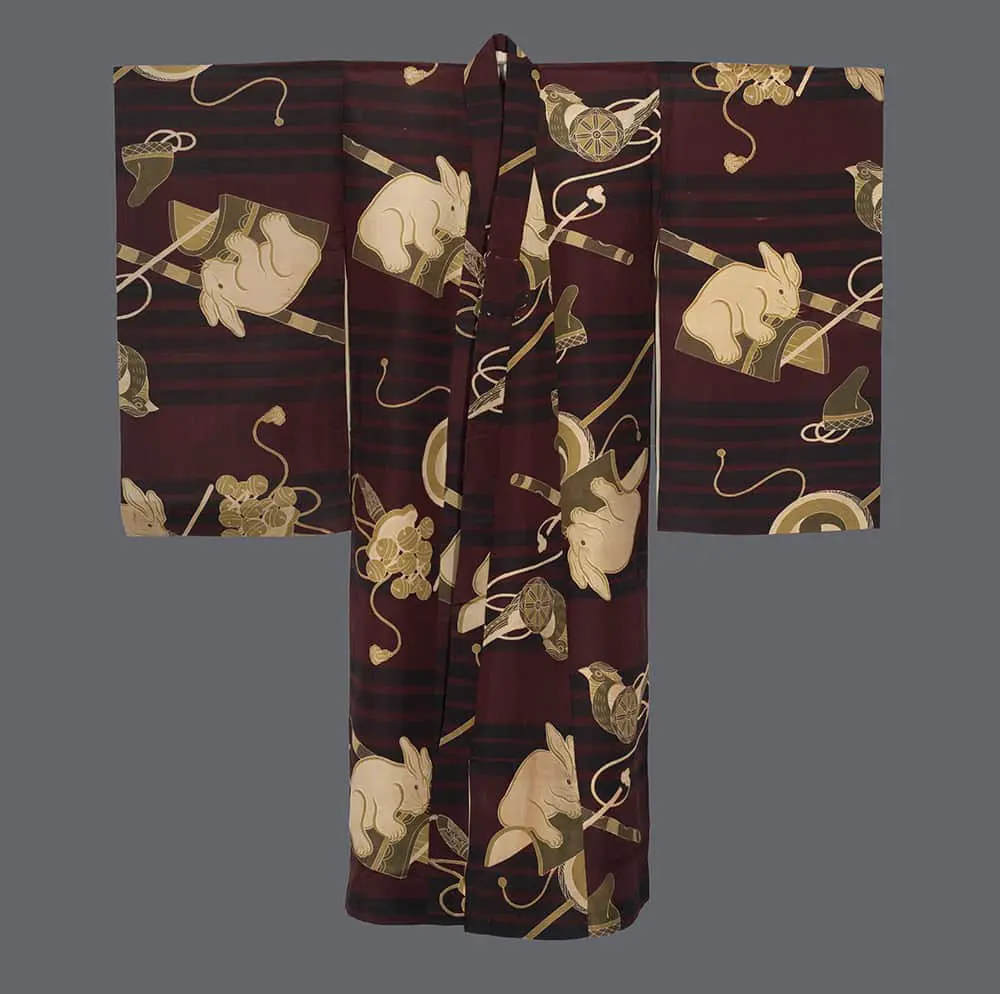 Symbolically, this kimono functions as a textile prayer for the child's future, with each element carrying specific cultural weight. The Heian court caps represent refinement, education, and social elevation, while the drums and kagura bells evoke the sacred music that accompanies Shinto rituals, connecting the wearer to Japan's spiritual traditions. The choice to deviate from typical miyamairi aesthetics while maintaining the functional twin ribbon straps suggests a progressive family that valued innovation within tradition, making this garment a fascinating document of Japan's cultural modernization during the interwar period.