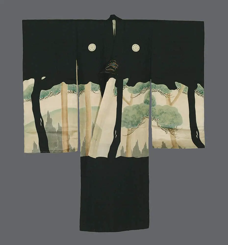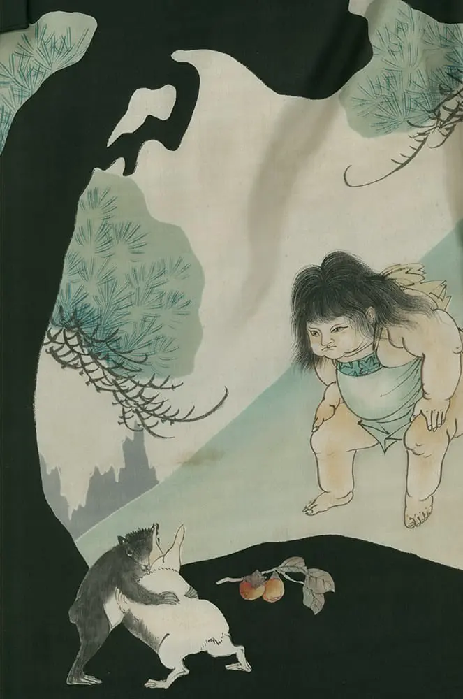 This remarkable miyamairi kimono represents a fascinating intersection between popular ukiyo-e printmaking and luxury textile arts during the late Meiji period. The garment transforms the legendary tale of Kintarō into an intimate, wearable narrative through sophisticated yuzen-dyeing techniques that demonstrate the period's technical mastery and artistic innovation. The composition centers on the folkloric hero Kintarō, depicted as a robust child figure positioned beneath sweeping pine boughs that create a dramatic canopy across the kimono's upper section. The artist has employed a sophisticated use of negative space, with the deep black fabric serving as both forest shadows and compositional framework, while lighter tones illuminate the central action.