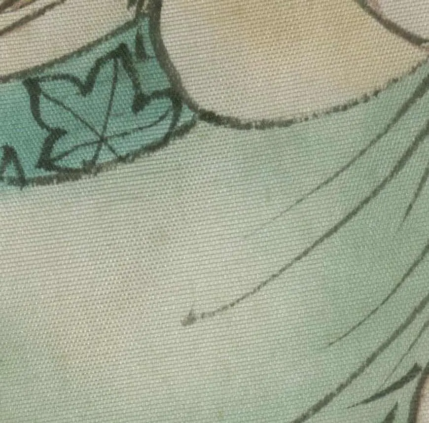 It measures 24 inches (61 cm) across the sleeves and stands at 38 inches (97 cm) in height, bearing various smudges and light stains due to age.