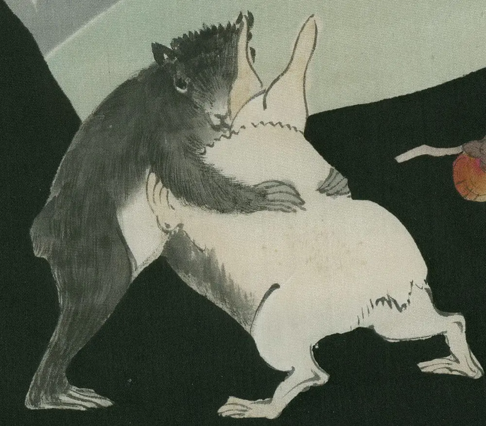 The artistic execution reflects the influence of Tsukioka Yoshitoshi's 1890 woodblock print "Moon of Kintoki's Mountain," yet the kimono designer has reinterpreted the source material with considerable creative liberty. Where Yoshitoshi's print emphasized the moonlit, mystical quality of the mountain setting, this textile adaptation focuses on the earthbound interaction between Kintarō and his animal companions. The presence of what appears to be a rabbit and another creature, possibly a monkey or bear, creates a playful domestic scene that speaks to the garment's intended use for a child's ceremonial wear. The inclusion of vegetables and the overall forest setting reinforces Kintarō's connection to nature and his role as a bridge between the human and animal worlds.