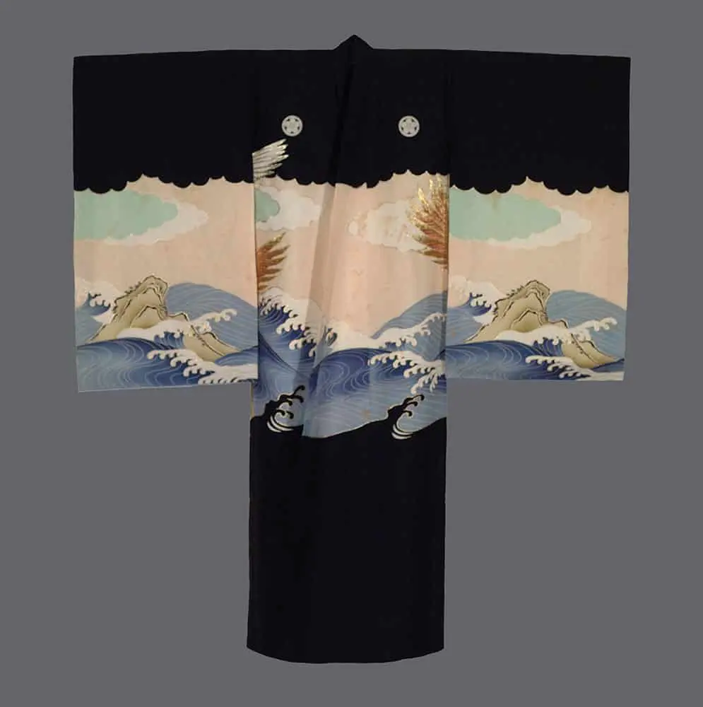 This silk boy's kimono displays eagles through machine embroidery. However, it's in fair condition, bearing a noticeable amount of yellowish stains on the front and some on the back. Measuring approximately 32 inches (81 cm) from sleeve-end to sleeve-end and standing at 37 inches (94 cm) in height, despite its condition, it retains its distinctive design.