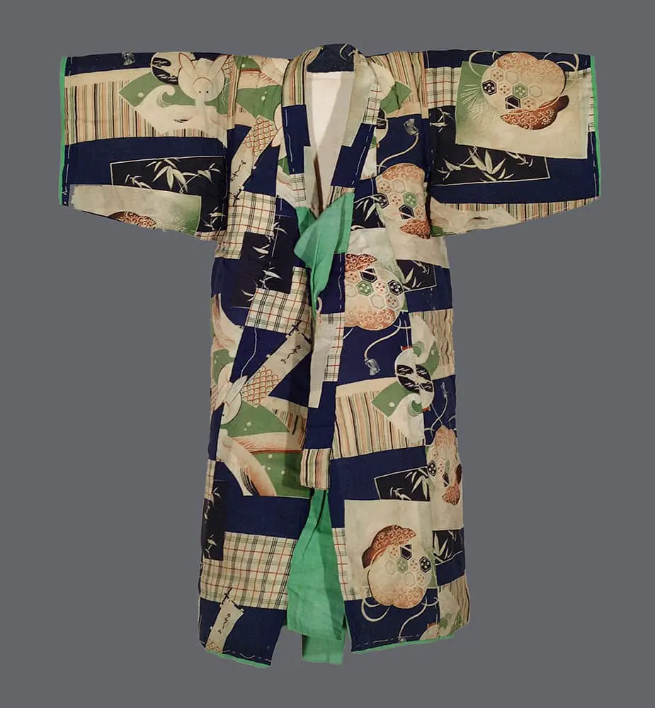 This small, heavily-padded winter kimono made of cotton measures 28 inches in width (71 cm) and 30 inches in height (76 cm). Despite its various small imperfections, it can serve as a decorative piece or be repurposed for creative projects where imperfections are not a concern.